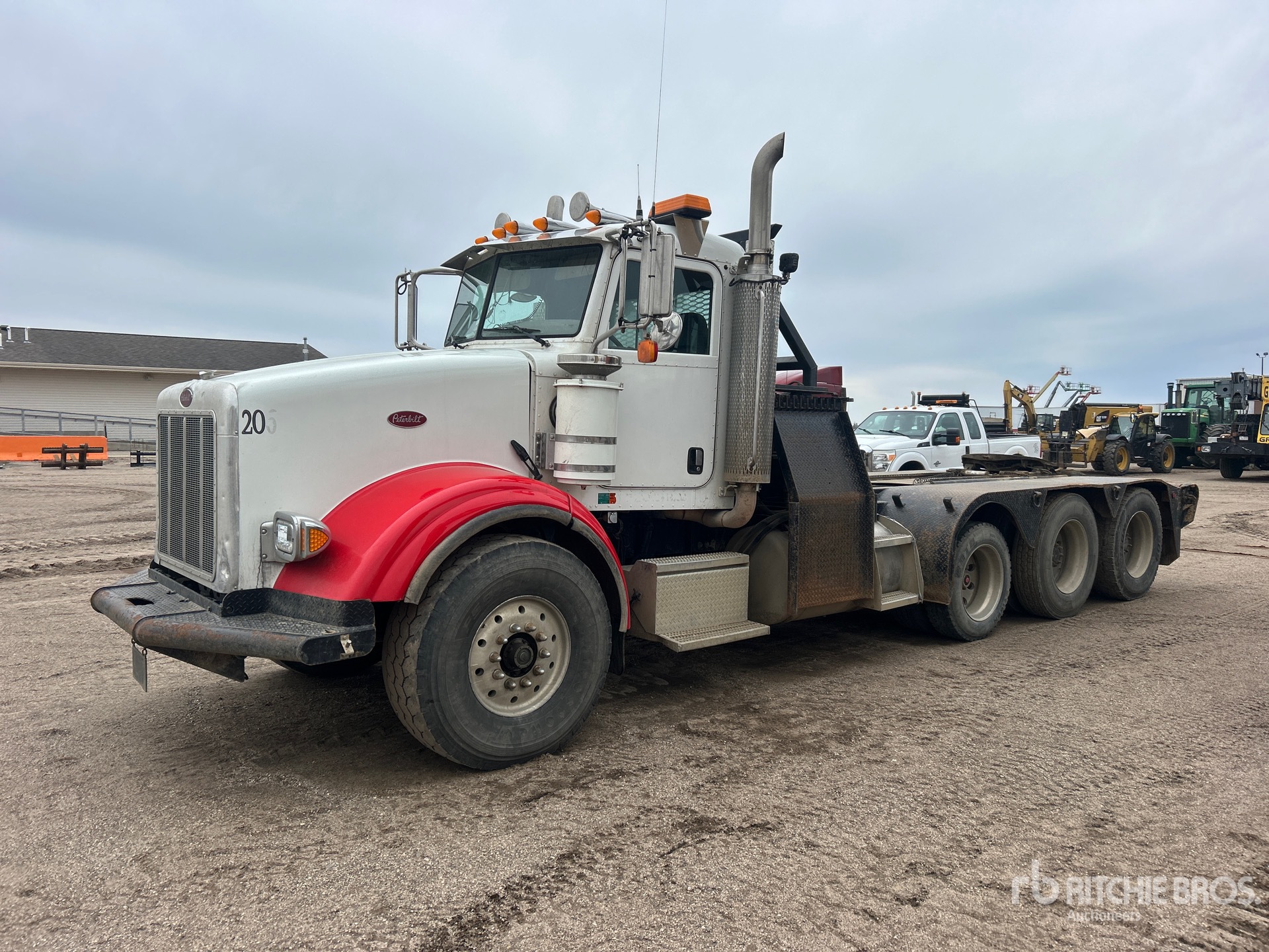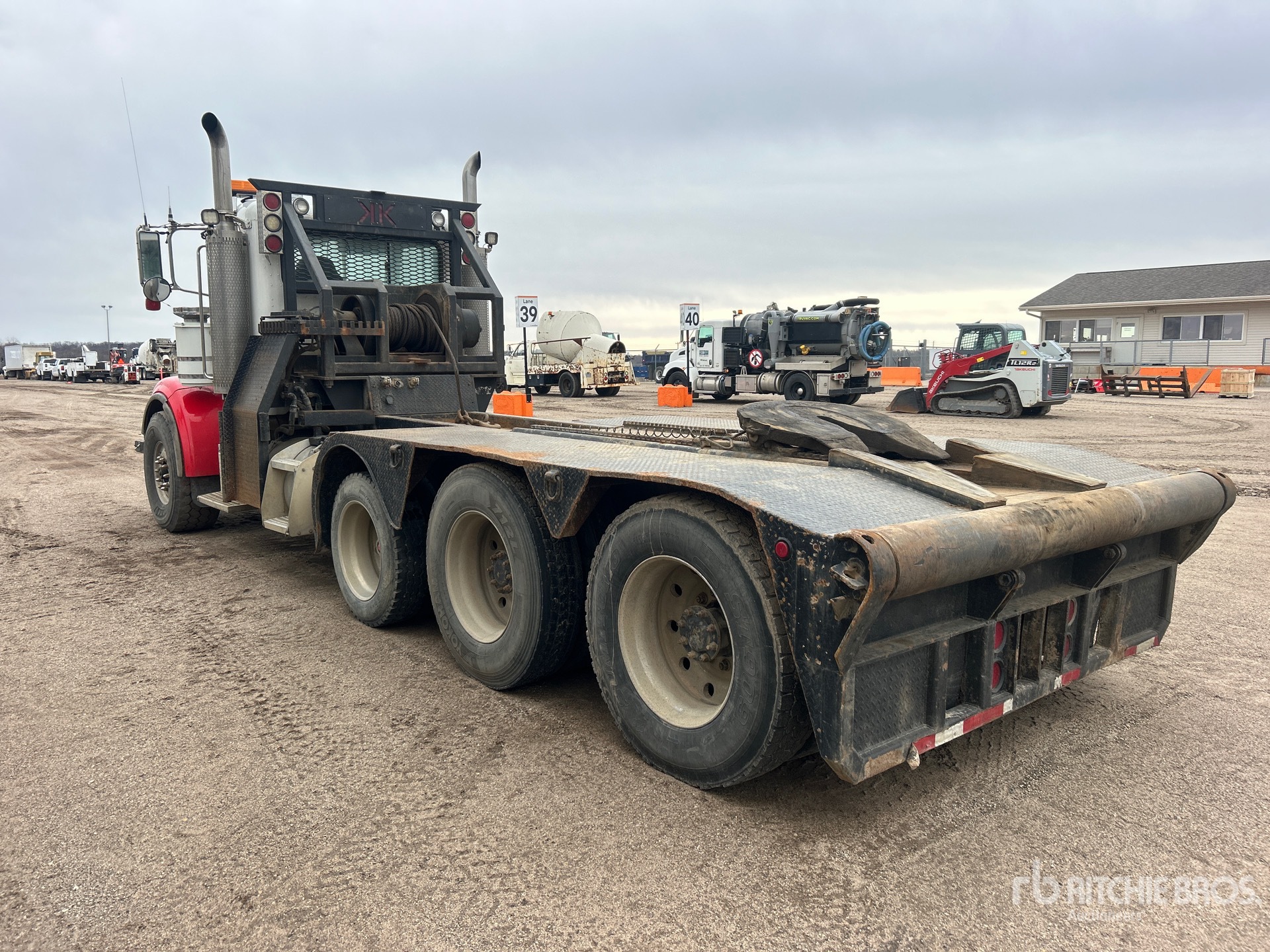 Cummins Engine, 16995 Engine hrs, Eaton Fuller 18-Speed Manual Transmission, 20000 lb Front Axle, 66280 lb Rears, 83000 lb GVWR, 248 in Wheelbase, Air Suspension, Air Lift Pusher Axle, Aluminum Outer Wheels, 445/65R22.5 Front Tires, 11R24.5 Rear Tires, Air Sliding 5th Wheel, Dual Fuel Tanks, Winch, Lowboy Ramps, Rolling Tailboard
