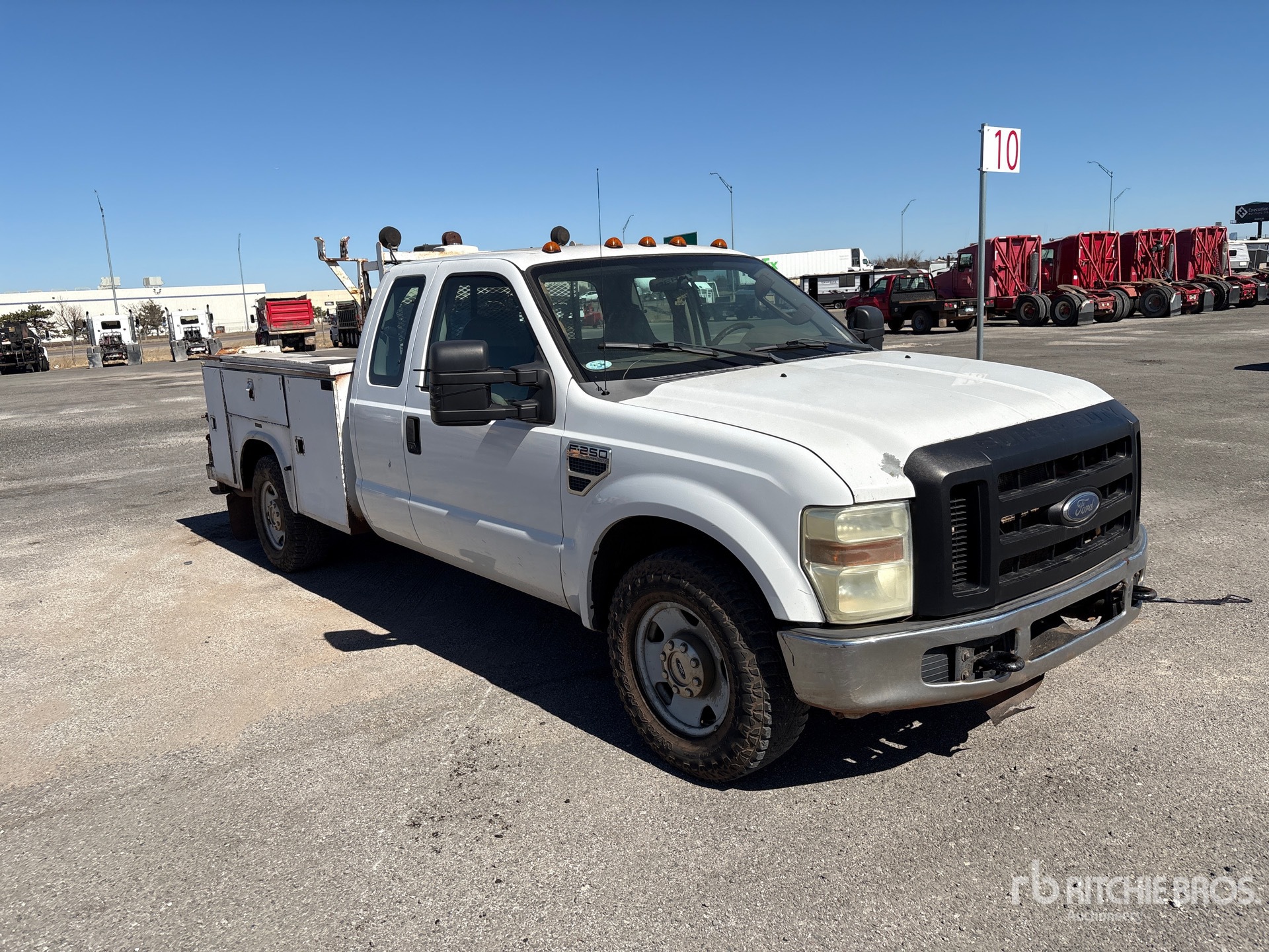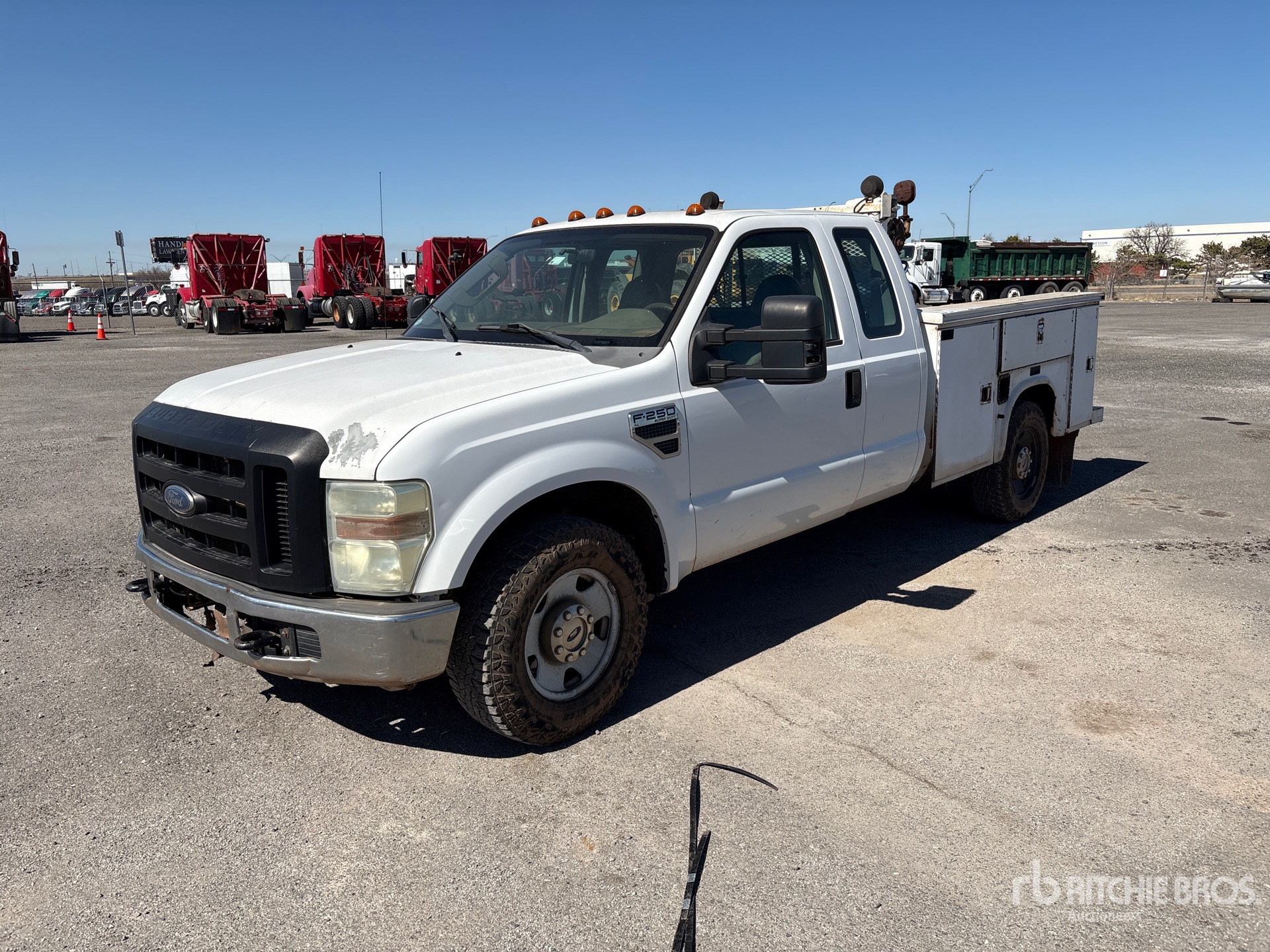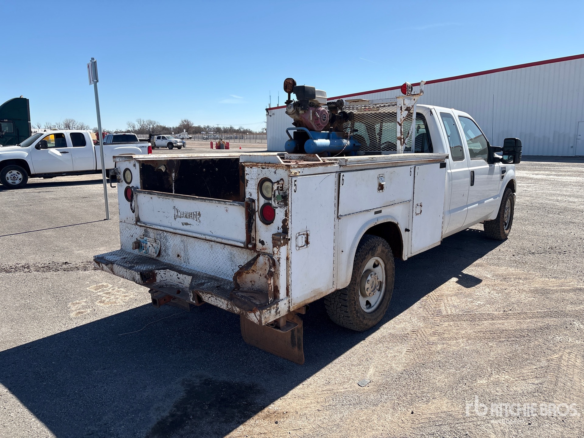 Ford V8 5.4 L Gasoline Engine, 2008 US EPA Label, Automatic Transmission, 4400 lb Front Axle, 6100 lb Rears, 9200 lb GVWR, 265/70R17, Spring Suspension, 158 in Wheelbase, Knapheide 8 ft 2 in Body, Manual Stabilizers, Gasoline Air Compressor