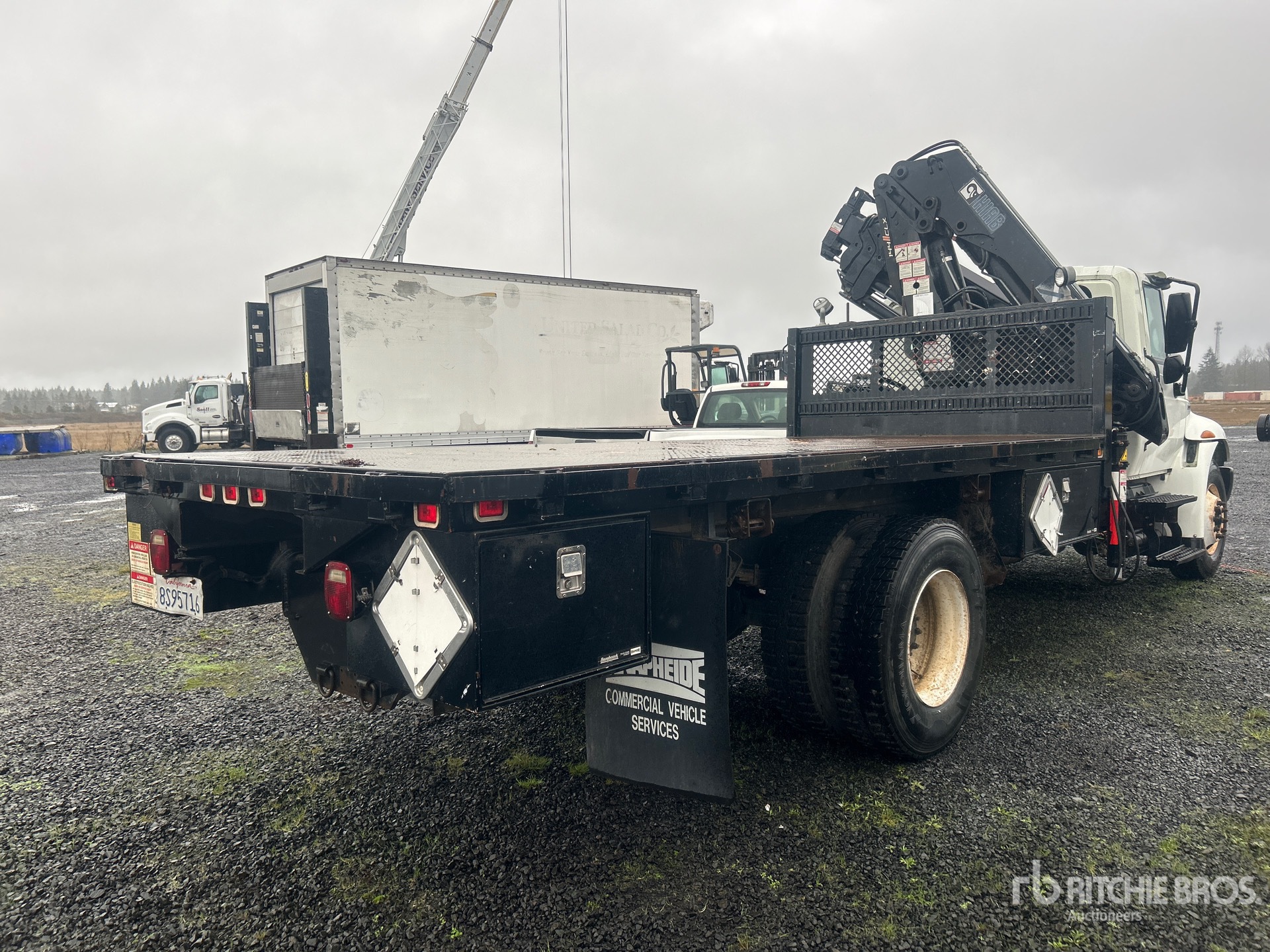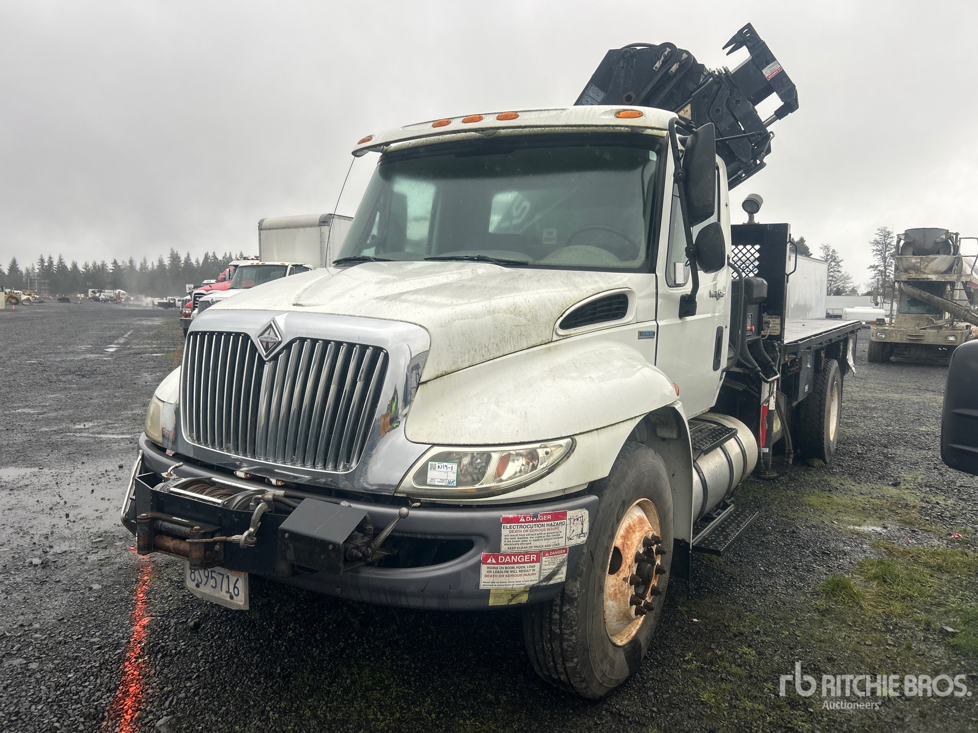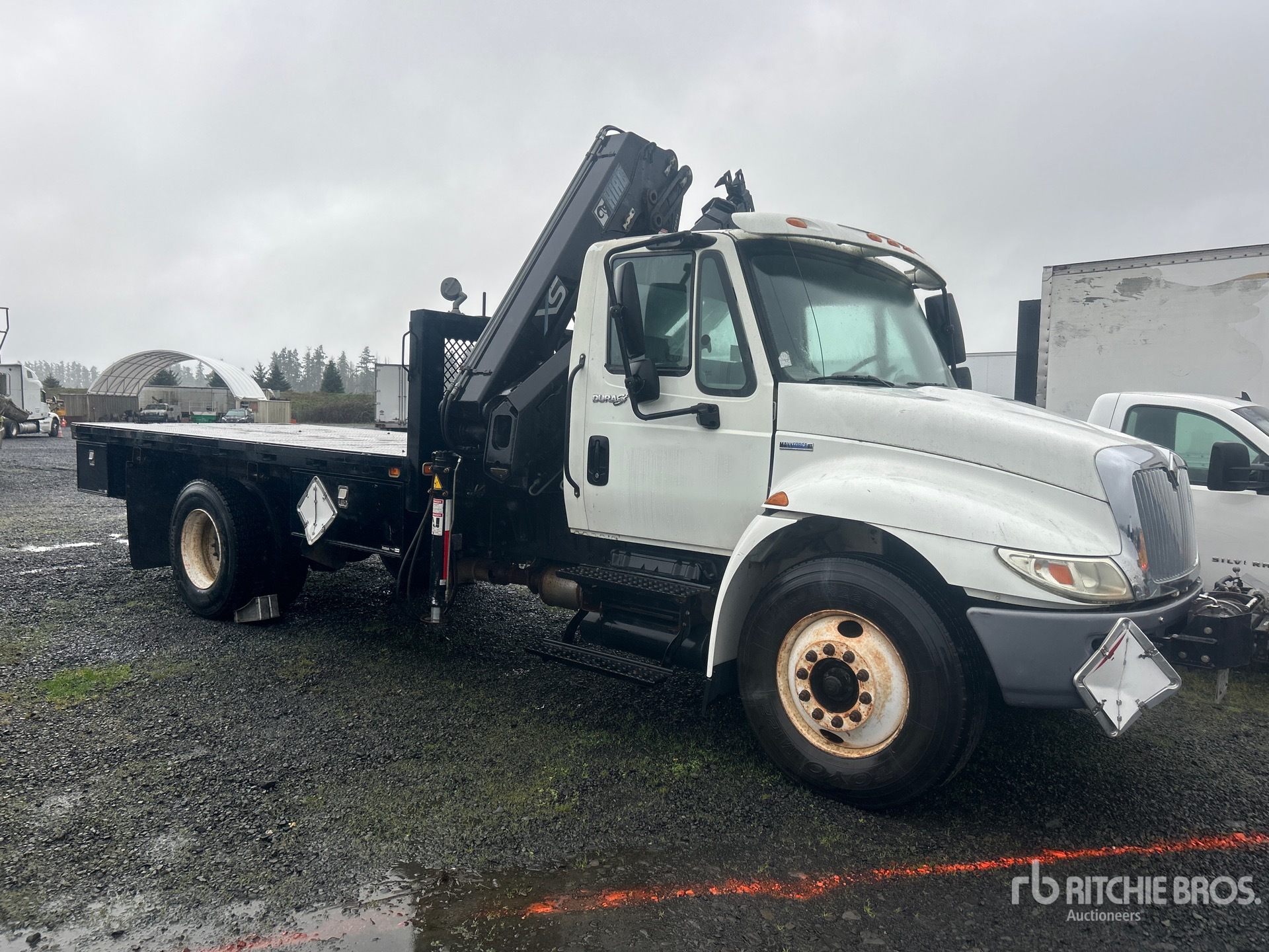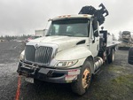 International MaxxForce DT 6 Cylinder 7.6 cid Diesel 245 hp Engine, 2008 US EPA Label, 4159 Engine hrs, Allison Automatic Transmission, 12000 lb Front Axle, 21000 lb Rears, 33000 lb GVWR, 11R22.5, Spring Suspension, 206 in Wheelbase, 8 ft - 34 ft 4 Section Boom, Out and Down Outriggers, Cordless Remote Control, 16 ft x 90 in Bed, Winch