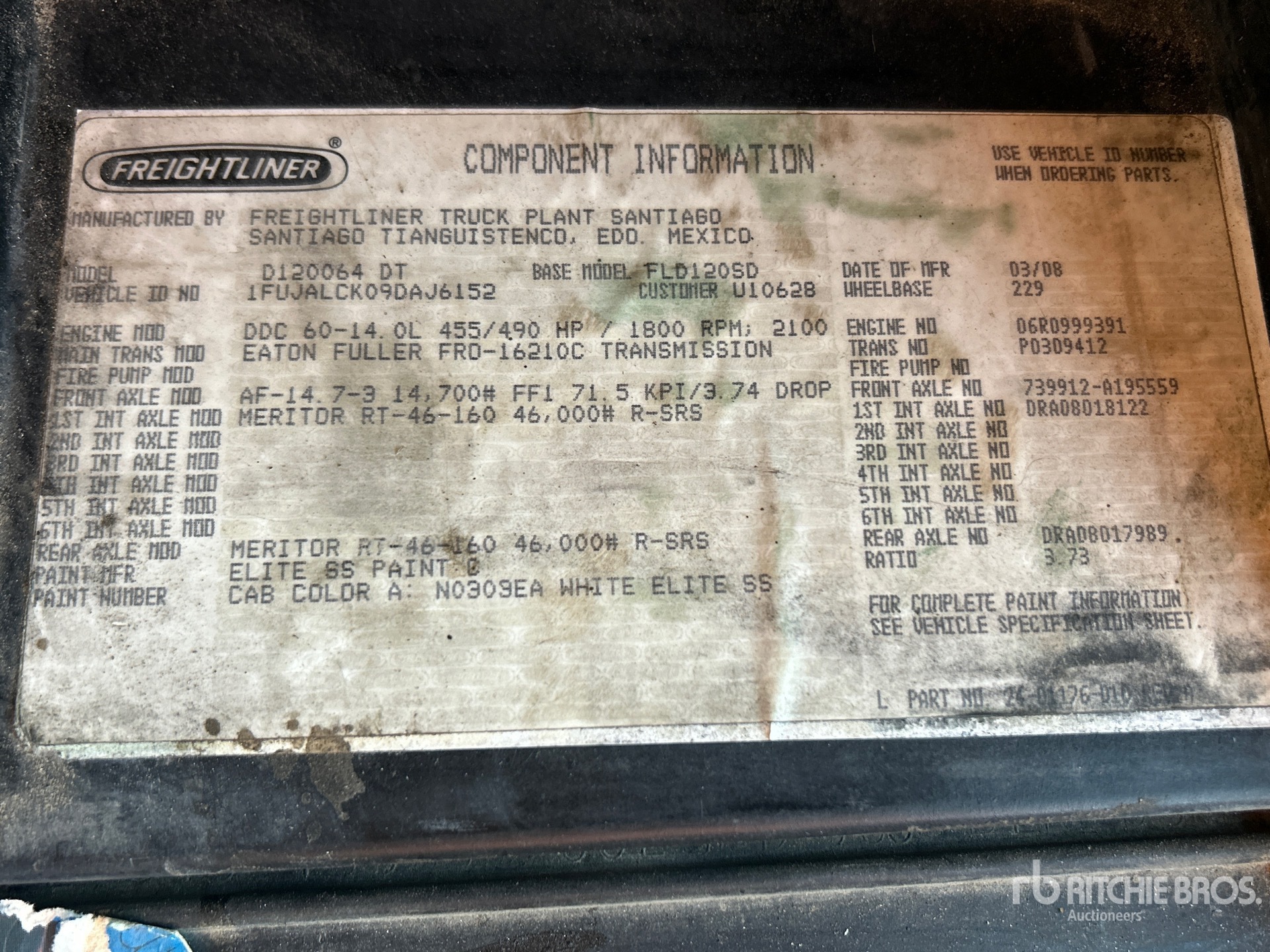Located in Lane 10 Spot 38, Detroit Series 60 455 hp Engine, 2008 US EPA Label, 26716 Engine hrs, Eaton Fuller FRO-16210C 10-Speed Manual Transmission, 14700 lb Front Axle, 46000 lb Rears, 60700 lb GVWR, Engine Brake, 229 in Wheelbase, Air Suspension, Aluminum Outer Wheels, 11R24.5, Air Sliding 5th Wheel, Dual Fuel Tanks