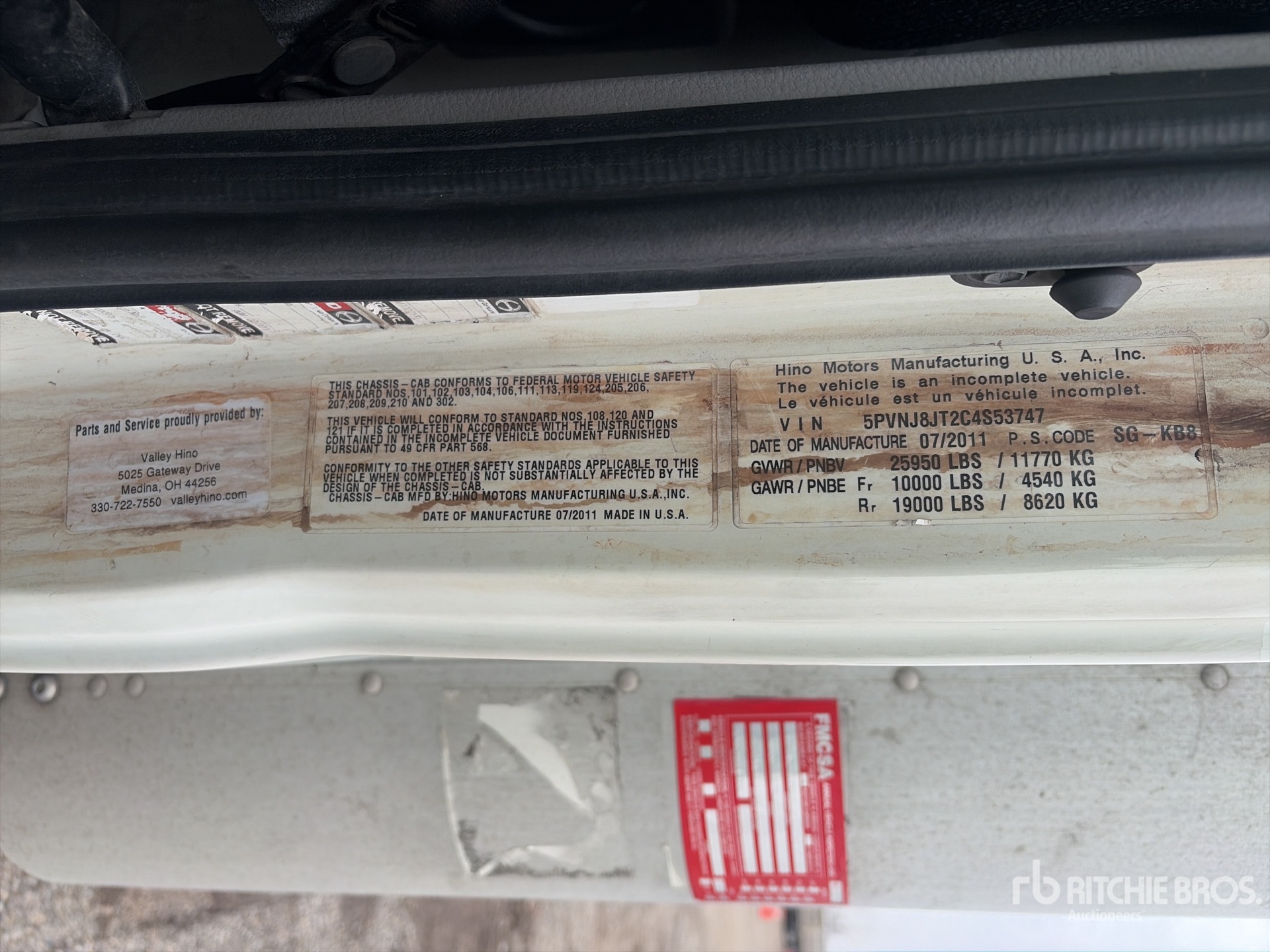 Hino J08E-VC 6 Cylinder 469 cid Diesel 220 hp Engine, 2011 US EPA Label, Automatic Transmission, 10000 lb Front Axle, 19000 lb Rears, 25950 lb GVWR, 295/75R22.5, Air Ride Suspension, 235 in Wheelbase, 23 ft x 96 in Wide x 86 in High Body