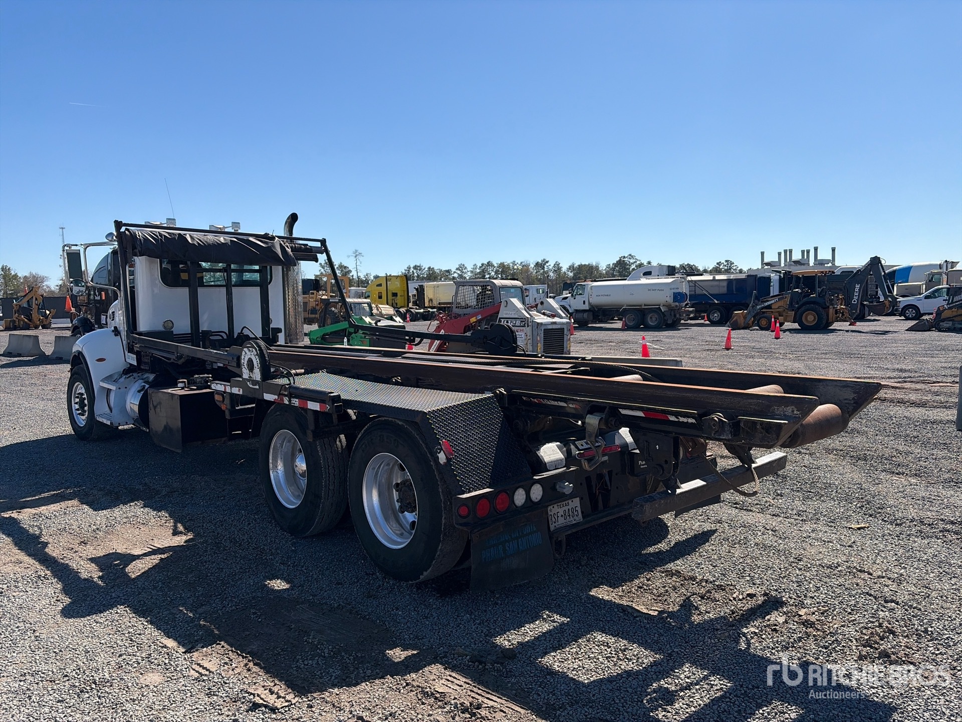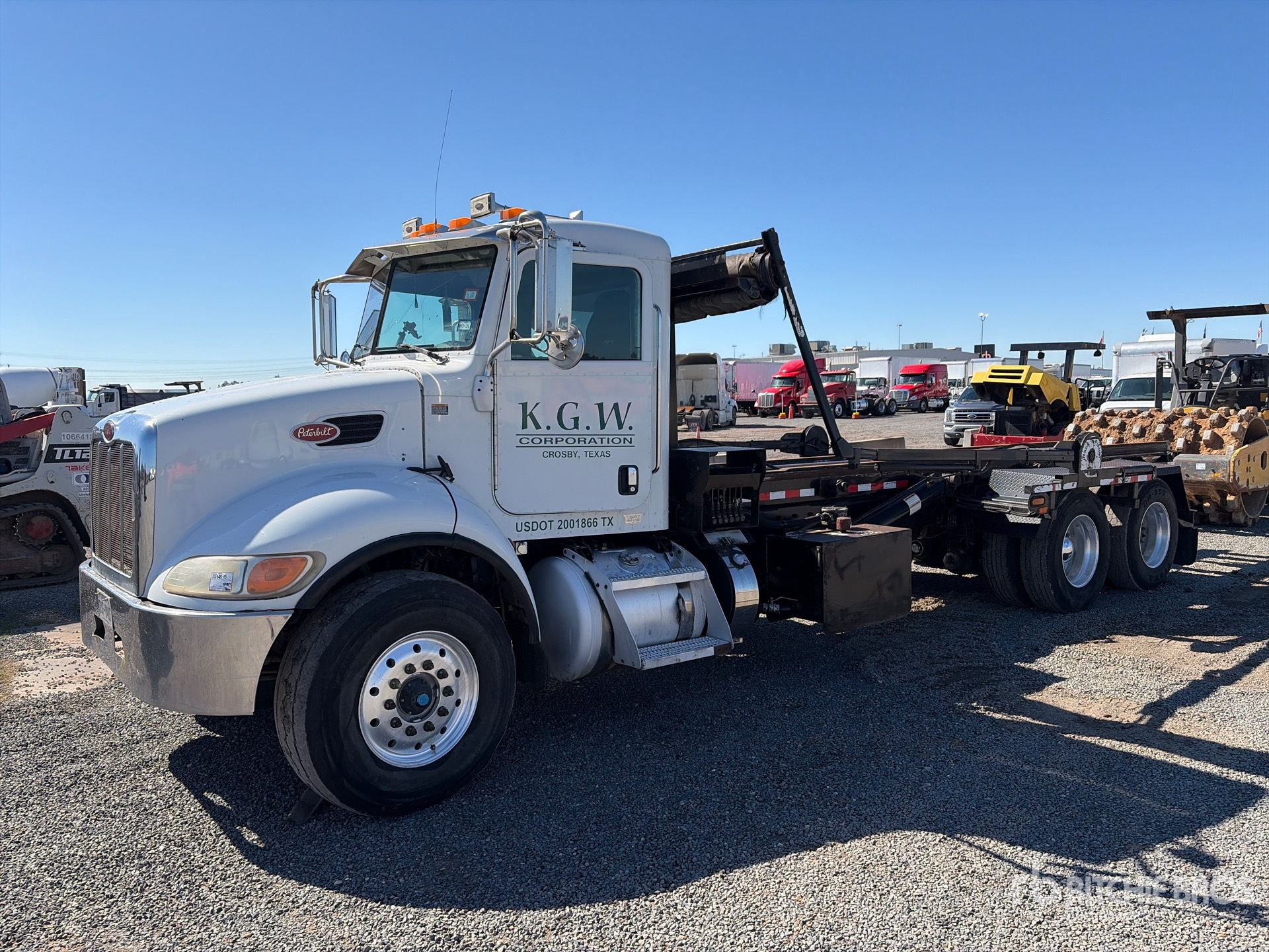 Paccar PX-8 6 Cylinder Diesel Engine, 8666 Engine hrs, Eaton Fuller RTLO11908LL 8LL Manual Transmission, 18740 lb Front Axle, 46000 lb Rears, 4.56:1 Axle Ratio, 64741 lb GVWR, Air Ride Cab, Aluminum Wheels, 385/55R22.5 Front Tires, 11R22.5 Rear Tires, Dual Steering Boxes, Air Ride Suspension, 257 in Wheelbase, PTO, 2012 Wastequip Roll-Off Body, 23 ft 4 in Hoist, Winch