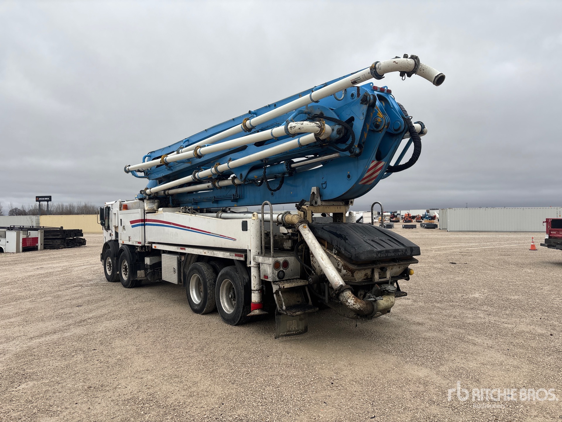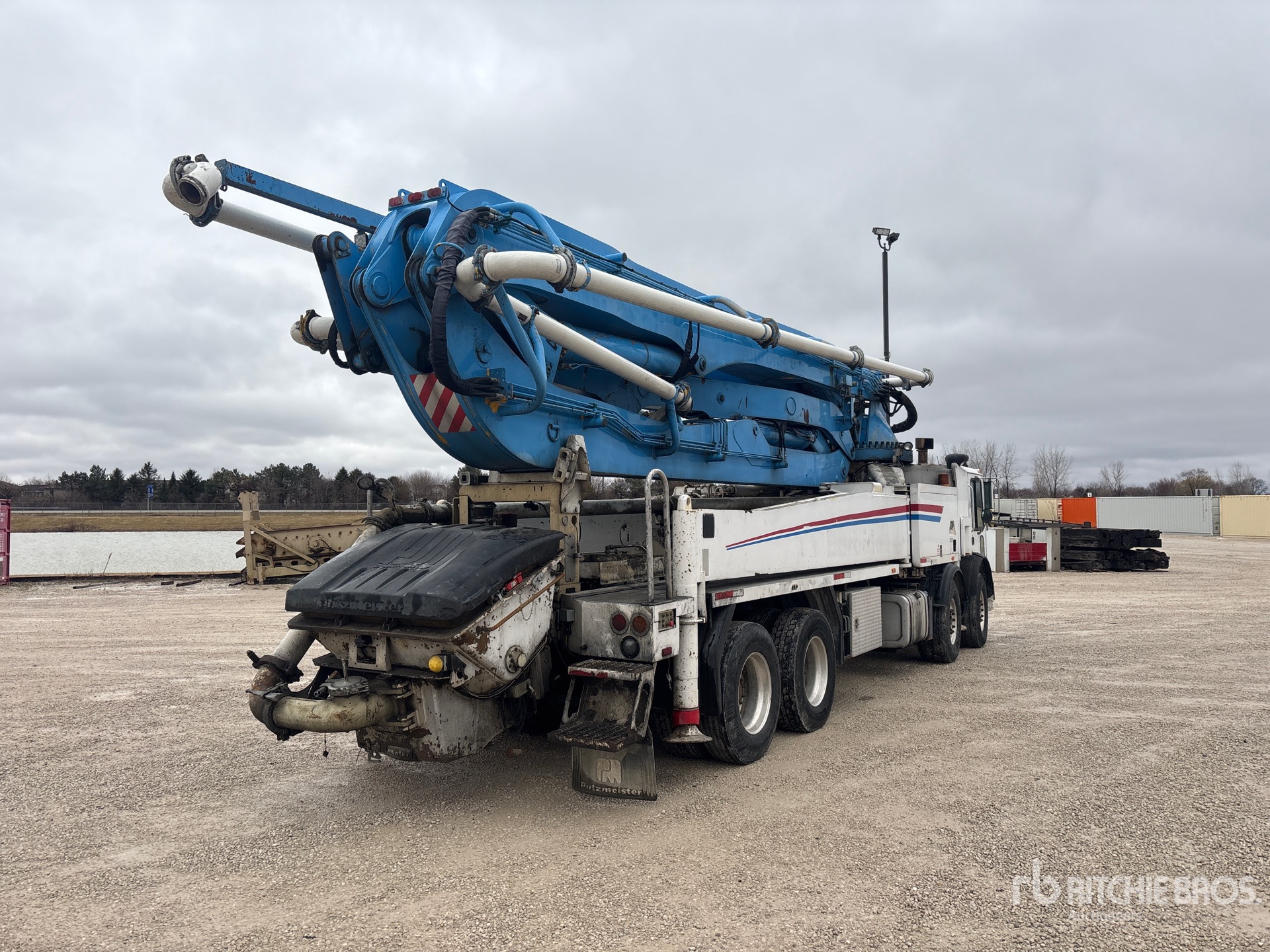 Mack MP7 Diesel 405 hp Engine, 2013 US EPA Label, 019543.5 Engine hrs, Engine Brake, Mack 10-Speed Manual Transmission, 20000 lb Front Axle, 44000 lb Rears, 64000 lb GVWR, Aluminum Wheels, 425/65R22.5 Front Tires, 11R22.5 Rear Tires, Dual Steering Boxes, Camelback Spring Suspension, 288 in Wheelbase, 2555.12 Pump Hours, Radio and Cable Remote Controls, Hopper Vibrator, Outrigger Pads
