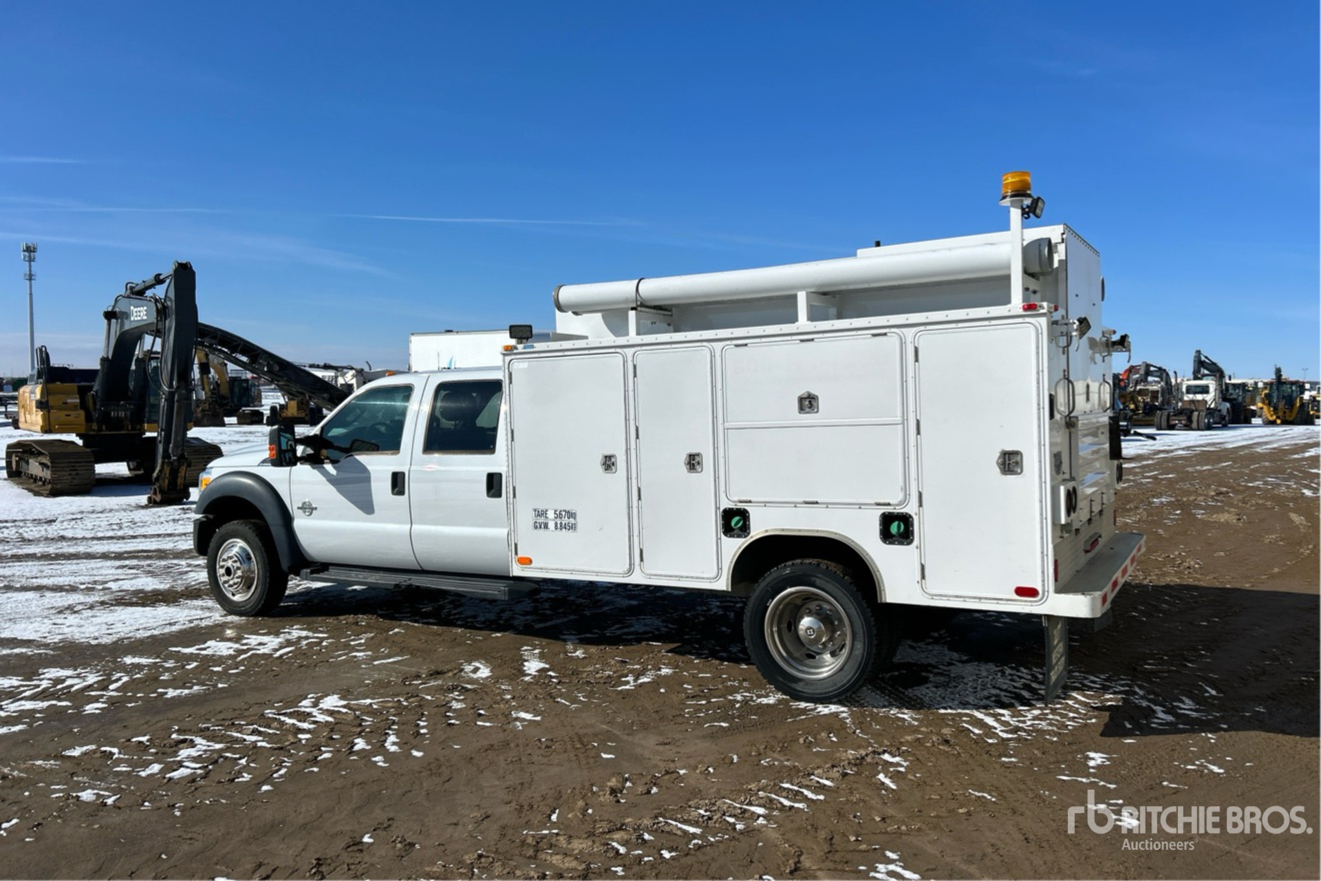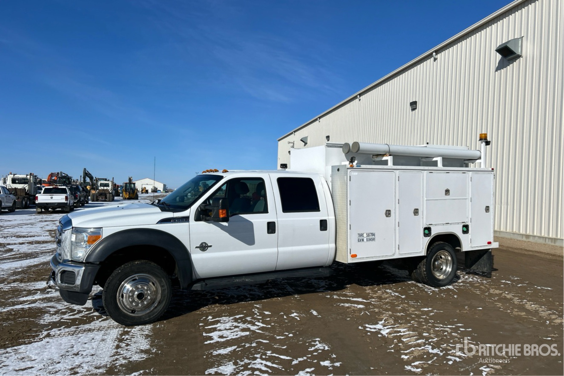 Power Stroke V8 6.7 L Diesel 300 hp Engine, 2014 US EPA Label, CARB Compliant, Requires Diesel Exhaust Fluid, 8434 Engine hrs, Automatic Transmission, 7000 lb Front Axle, 14706 lb Rears, 19500 lb GVWR, 225/70R19.5, Spring Suspension, 201 in Wheelbase, Western 11 ft Body, VMAC Air Compressor, Air Hose Reel