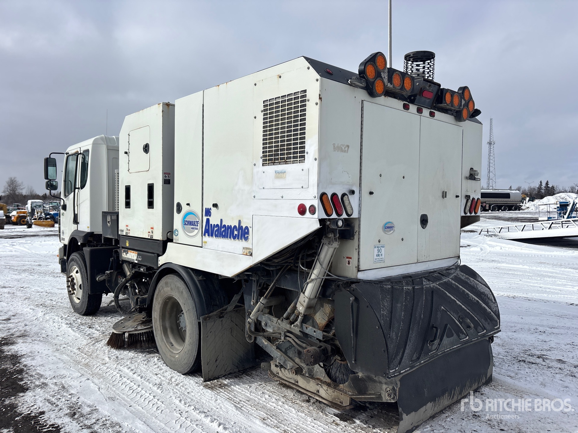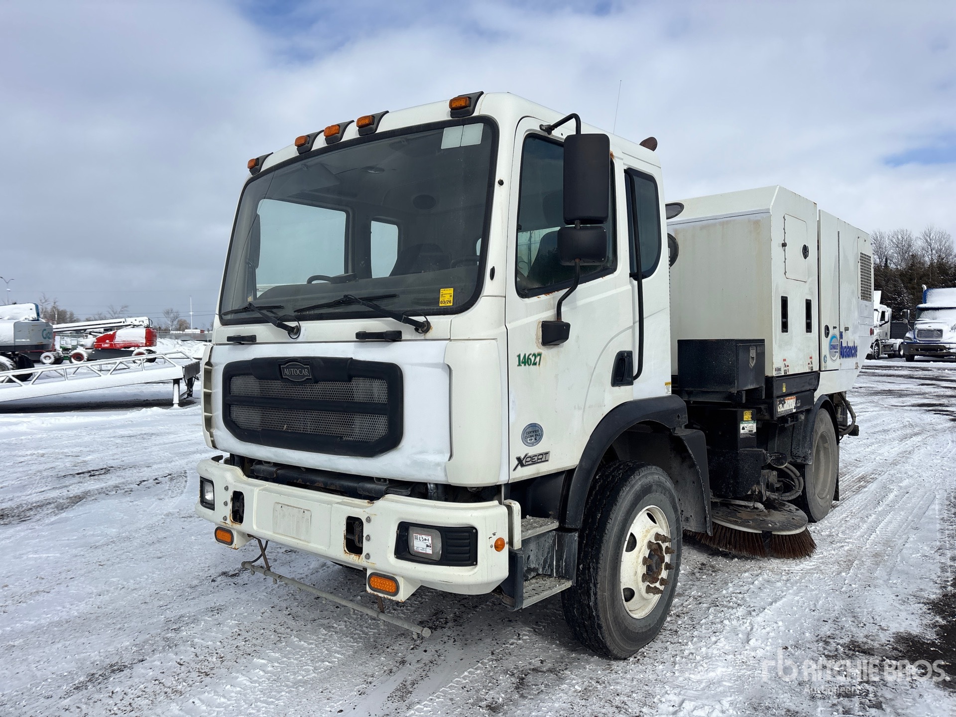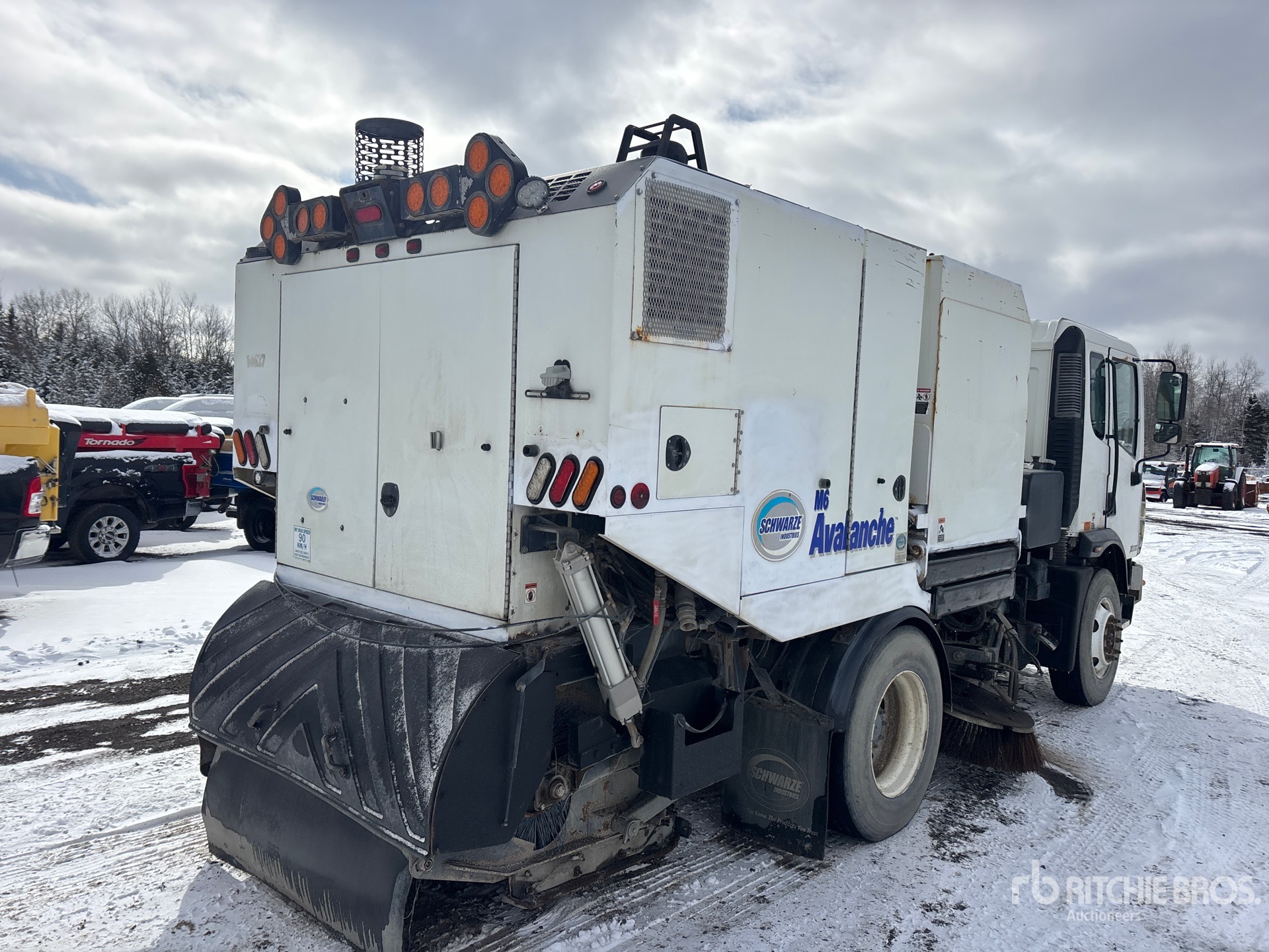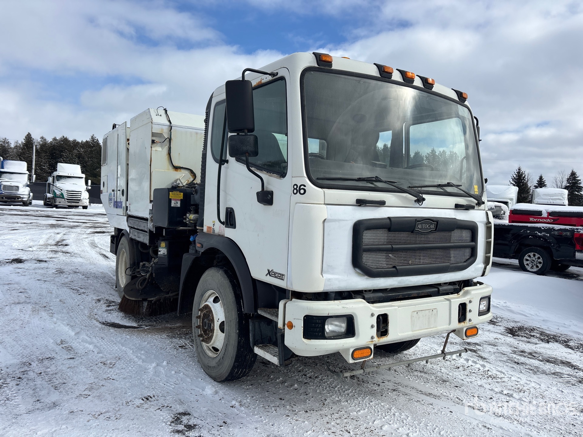 Cummins 4 Cylinder Diesel Engine, Requires Diesel Exhaust Fluid, Allison Automatic Transmission, 12000 lb Front Axle, 21000 lb Rears, 33000 lb GVWR, Aluminum Rear Wheels, 11R22.5, Spring Suspension, 136 in Wheelbase, Deutz Auxiliary Engine, Mechanical Broom Sweeper, Dual Controls, Front Spray Bar, 68 in Rear Broom, Gutter Brooms, Hydraulic Dump