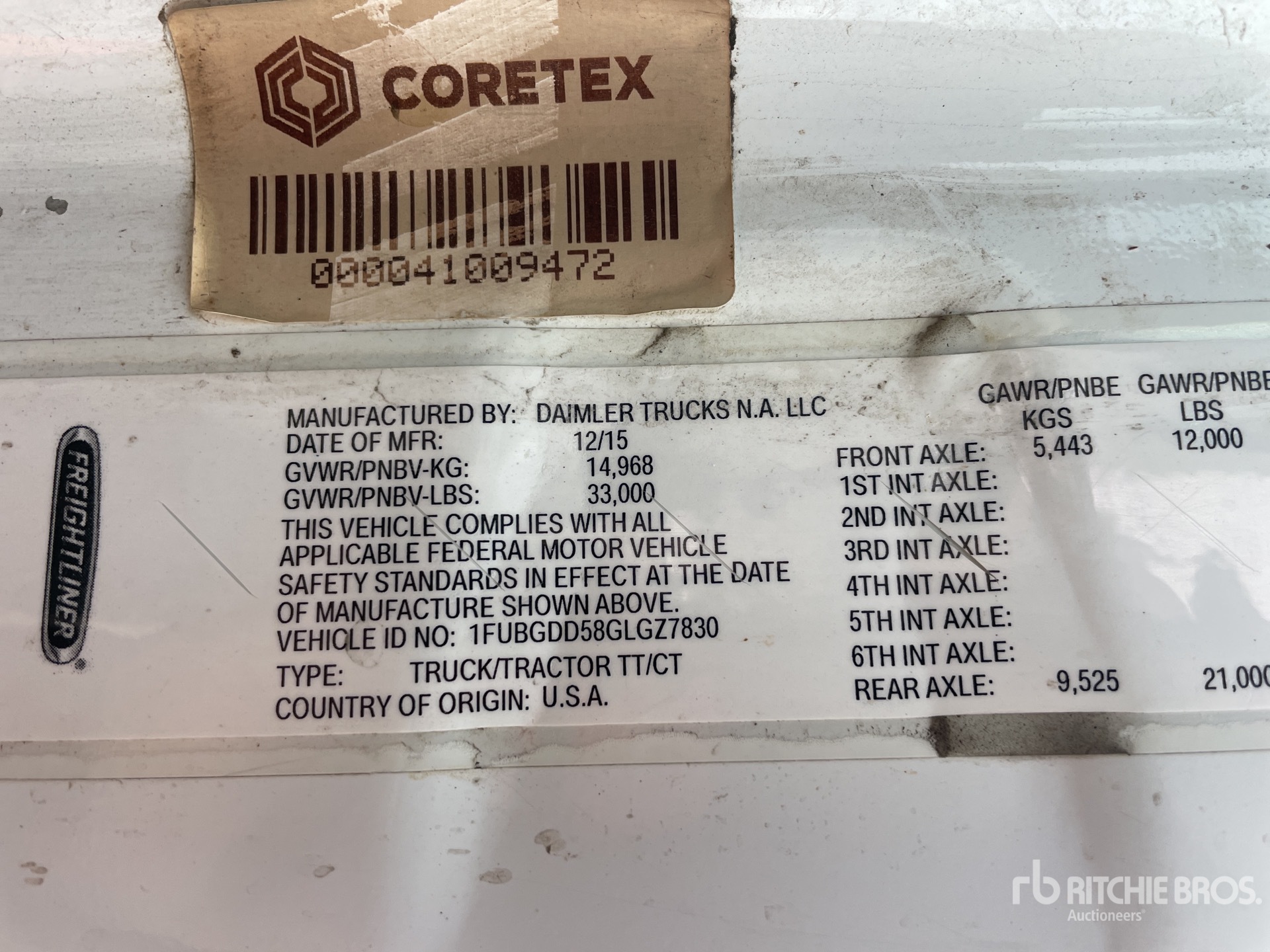 Detroit DD15 455 hp Engine, 11416 Engine hrs, 12000 lb Front Axle, 21000 lb Rears, 33000 lb GVWR, 158 in Wheelbase, Air Suspension, 11R22.5