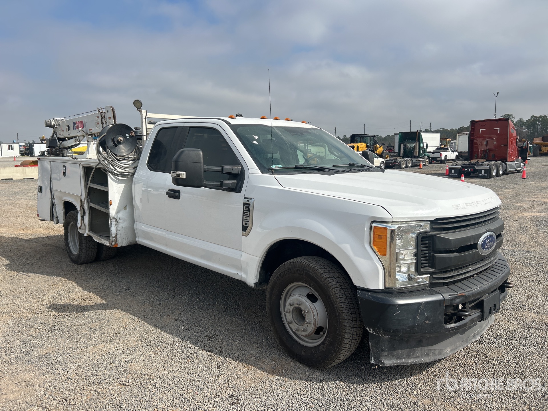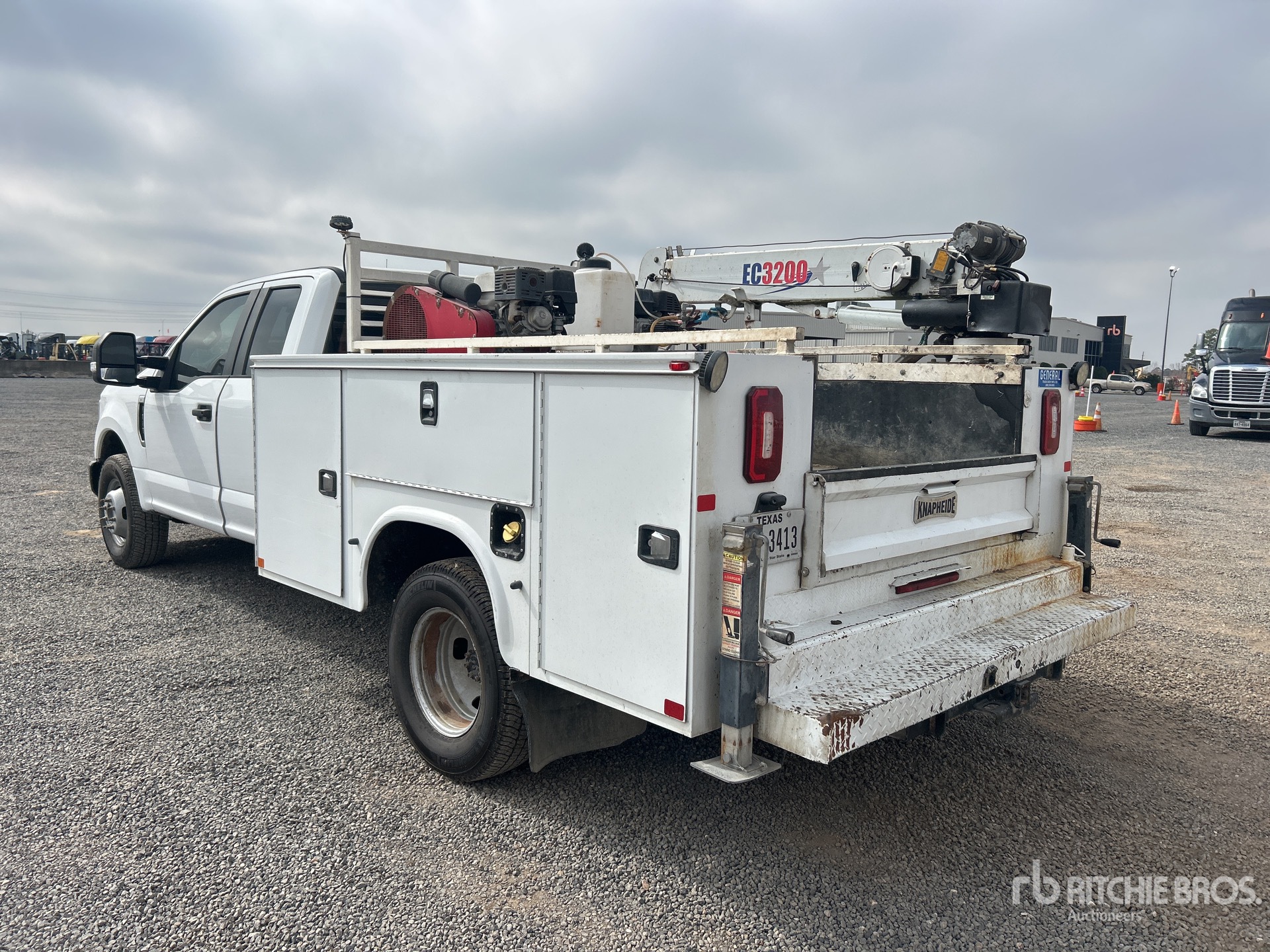 Located in Lane 15 Spot 10, V8 6.2 L Gasoline Engine, 2019 US EPA Label, Automatic Transmission, 4850 lb Front Axle, 10040 lb Rears, 14000 lb GVWR, 245/75R17, Spring Suspension, 106 in Wheelbase, Knapheide 8 ft Body, Manual Stabilizers, Stellar EC3200 3200 lb 3 Section Hydraulic Crane, North Star Gasoline Air Compressor