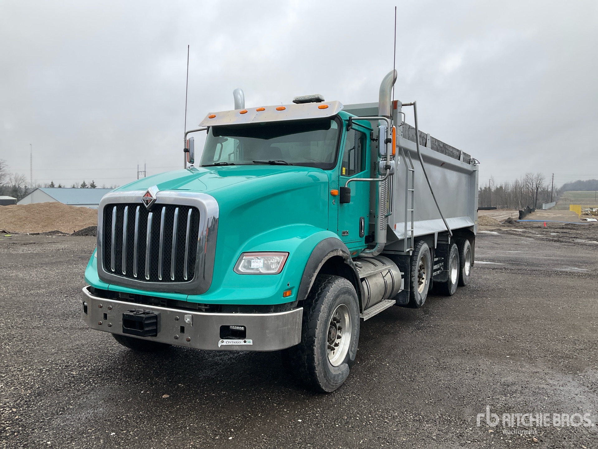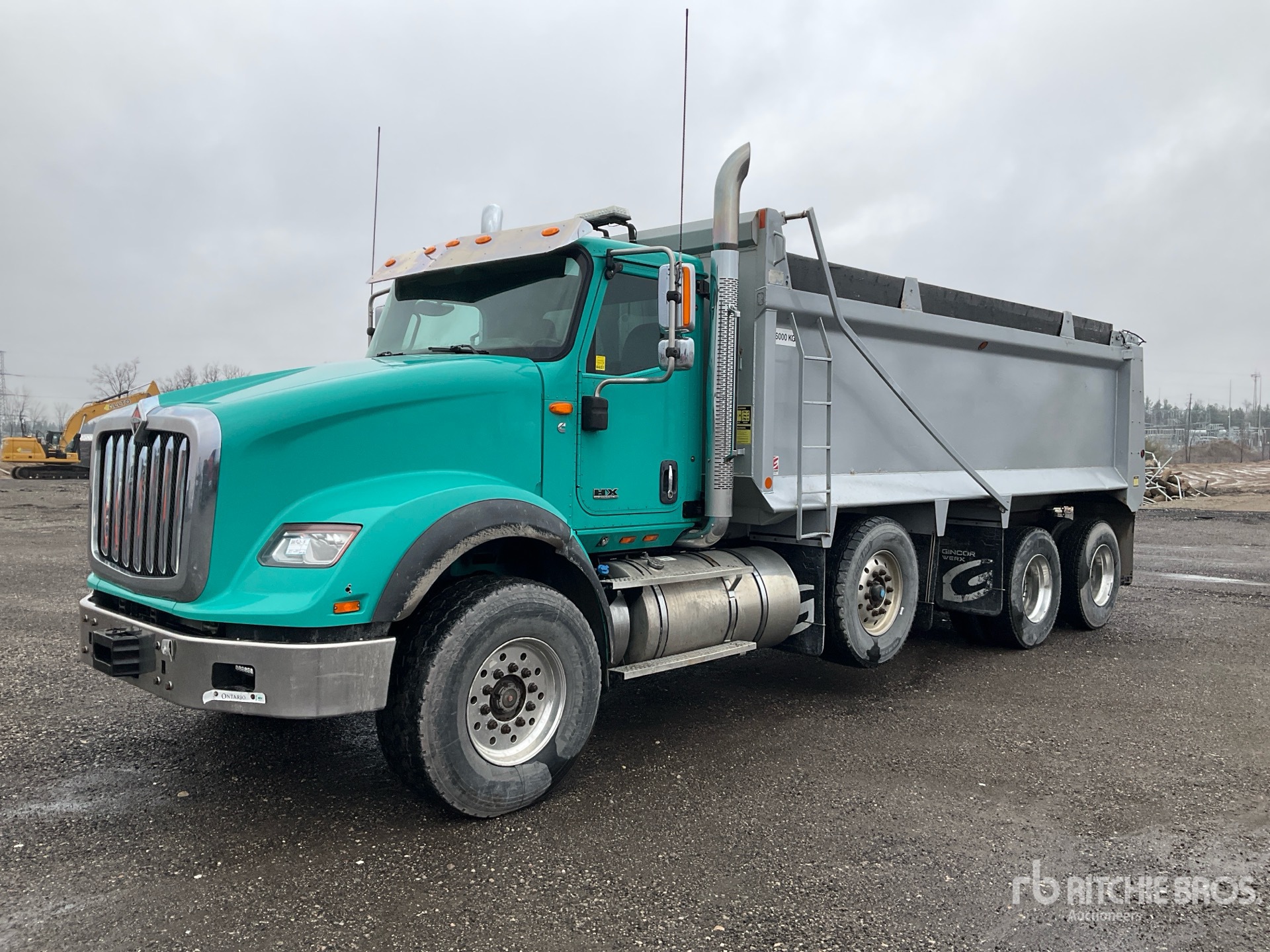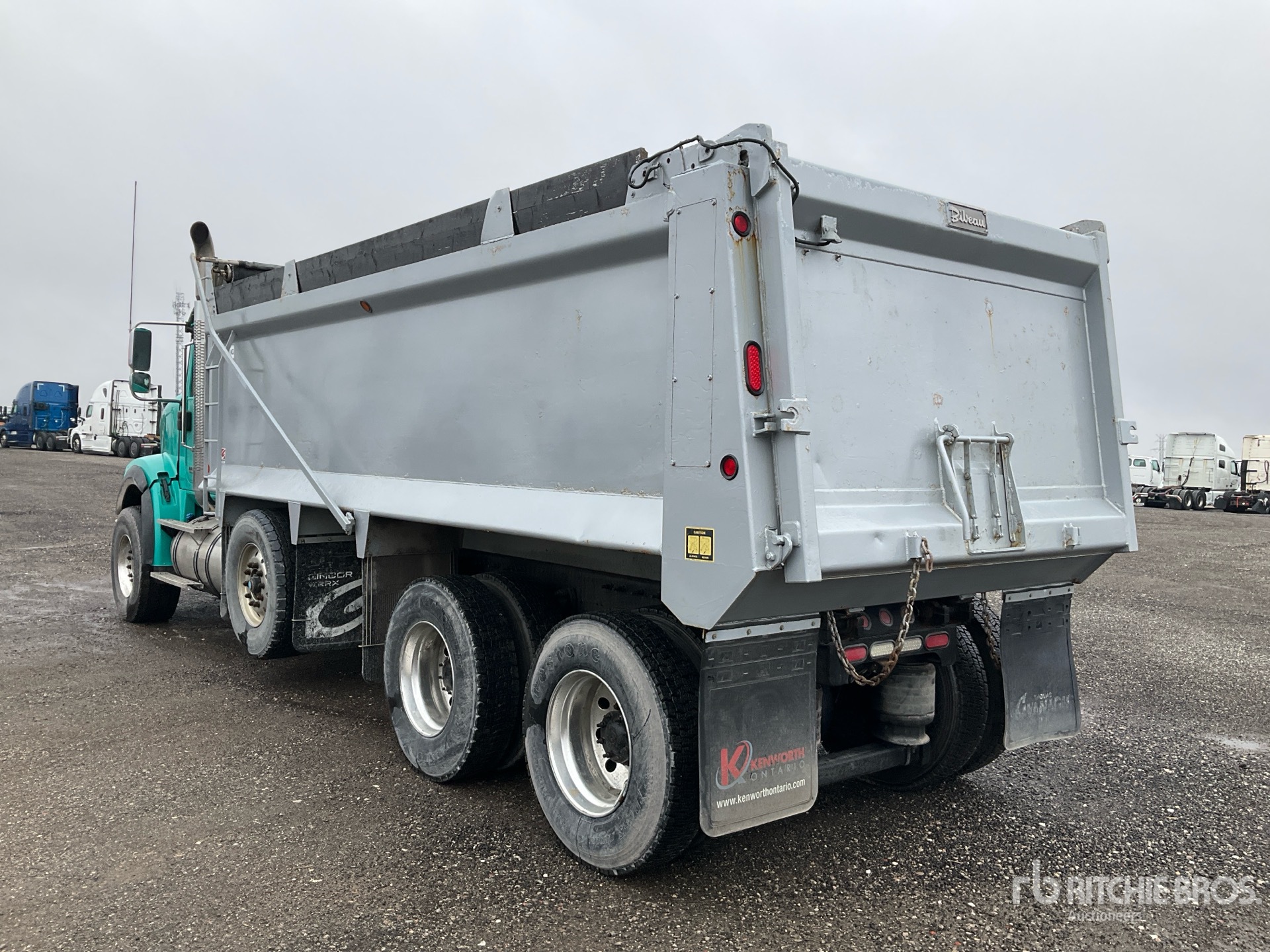 Cummins X15 6 Cylinder 15 L Diesel 500 hp Engine, 2019 US EPA Label, CARB Compliant, 9084 Engine hrs, Engine Brake, Eaton Fuller 18-Speed Manual Transmission, Double Differential Locks, 20000 lb Front Axle, 46000 lb Rears, 80000 lb GVWR, Air Ride Cab, Aluminum Wheels, 425/65R22.5 Front Tires, 11R22.5 Rear Tires, Dual Steering Boxes, Hendrickson Air Ride Suspension, 256 in Wheelbase, PTO, Bibeau 20 ft 6 in Long x 4 ft 6 in High Steel Body, Bed Vibrator, Auto Lube System, Air Powered Roll Tarp, Tailgate Chute