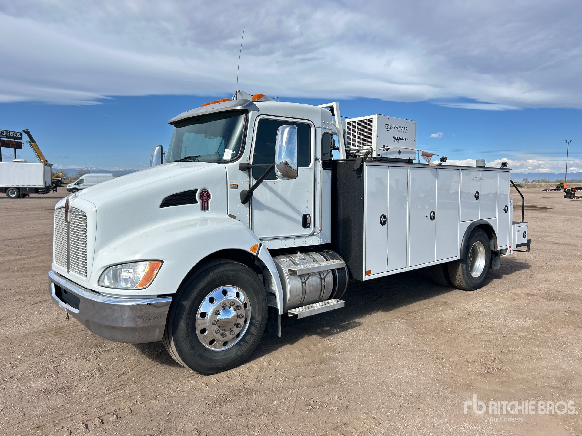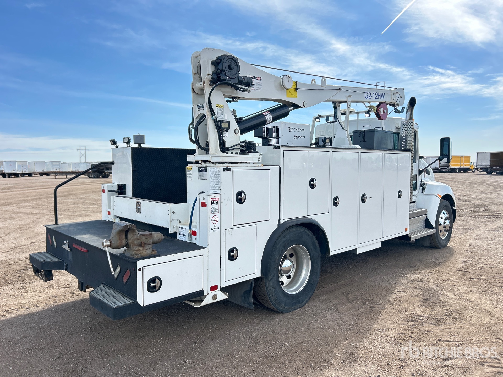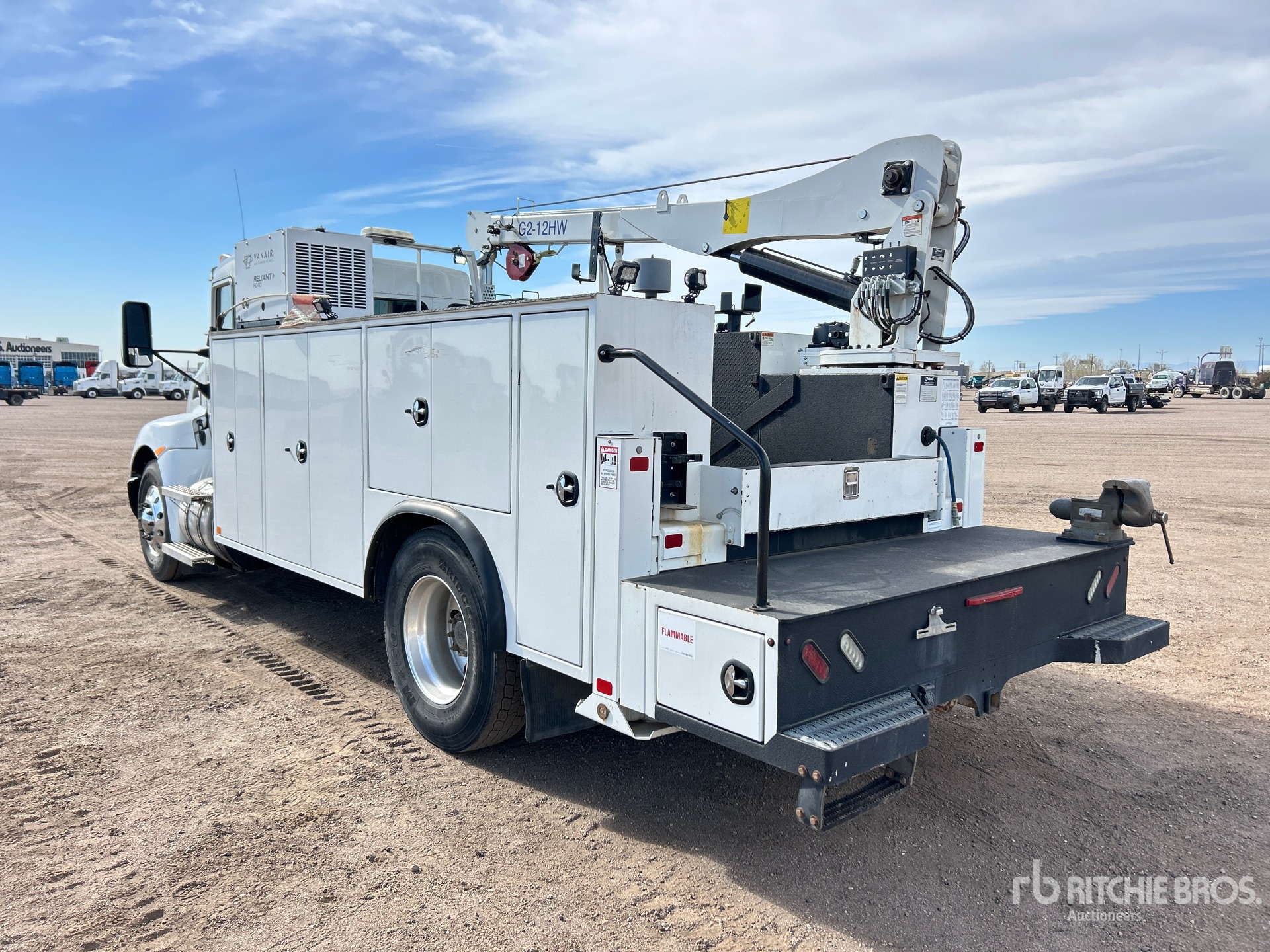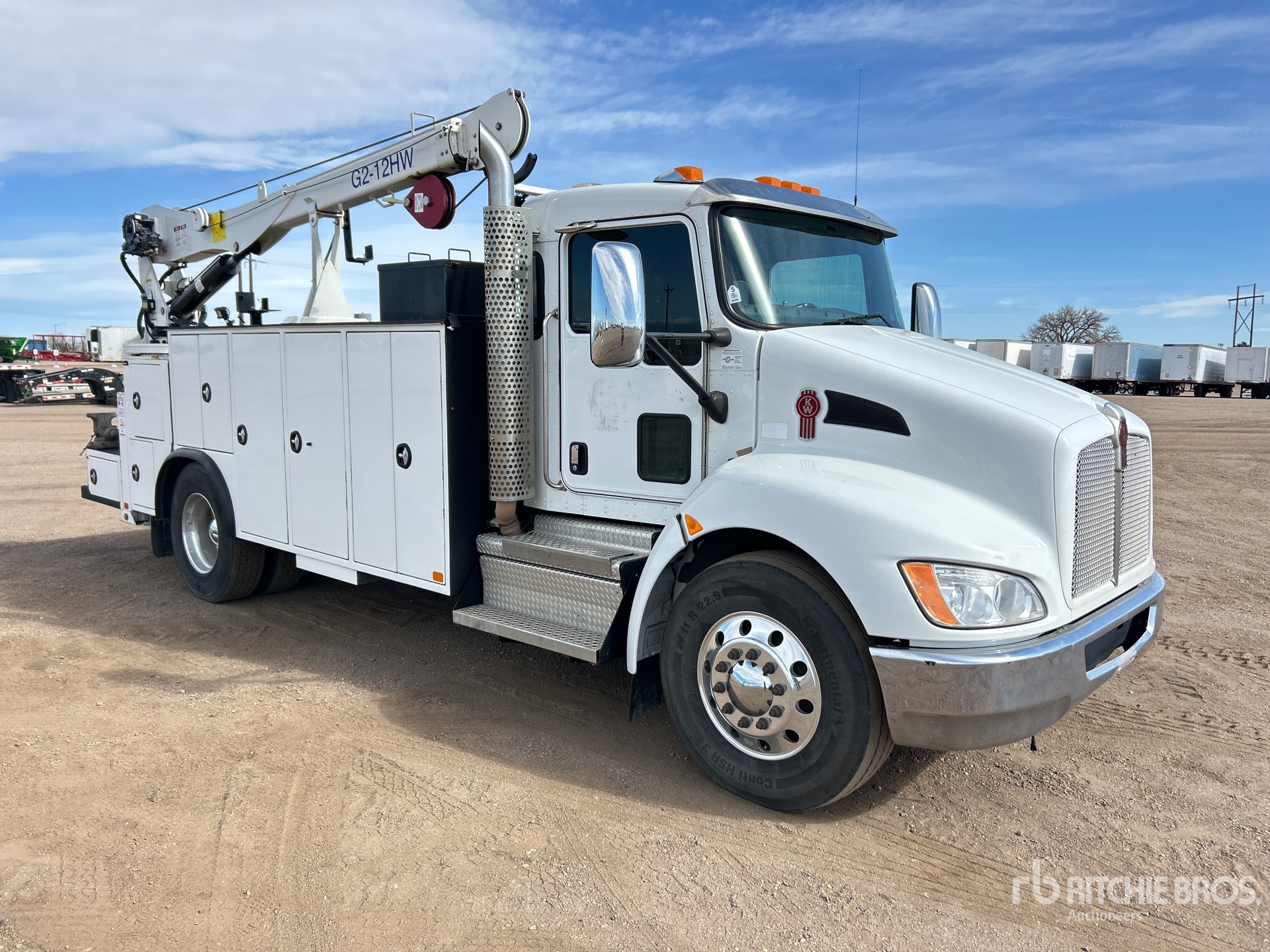 Located in Lane 8, Paccar PX-9 6 Cylinder 8.9 L Diesel 350 hp Engine, 2019 US EPA Label, 5989 Engine hrs, Engine Brake, Allison 3000 Automatic Transmission, 12000 lb Front Axle, 21000 lb Rears, Meritor MS-21-14X4 Drive Axles, 4.88:1 Axle Ratio, 33000 lb GVWR, Aluminum Wheels, 11R22.5, Air Ride Suspension, 190 in Wheelbase, PTO, Feterl 17 ft Body, Hydraulic Stabilizers, Feterl G2-12HW 12000 lb 2 Section Hydraulic Crane, Wireless Remote Control, Vanair RC40 Reliant Hydraulic Air Compressor, Air Hose Reel