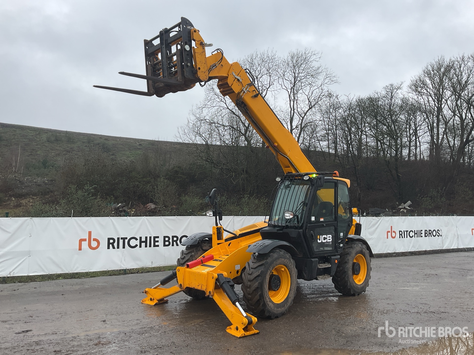 Enclosed Cab, Air Conditioner, Rear View Camera, Load Moment Indicator, 14 m Max Lift Height, 4000 kg Max Lift Capacity, 1070 mm Forks, Fork Positioner, Manual Coupler, Outriggers, Frame Leveling, Auxiliary Hydraulic Plumbing, 400/80-24 Tires