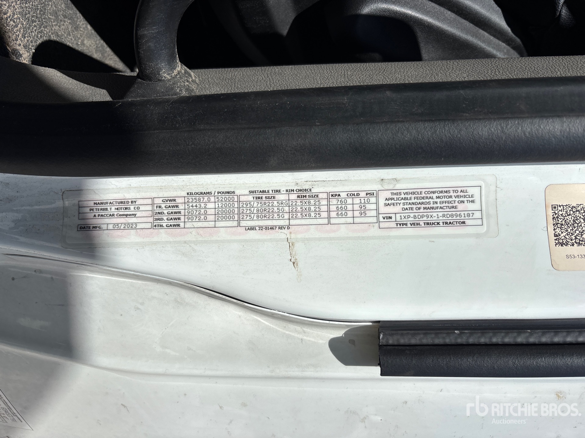 Paccar MX-13 456 hp Engine, 2023 US EPA Label, 10080 Engine hrs, Automated Transmission, 12000 lb Front Axle, 40000 lb Rears, 52000 lb GVWR, Engine Brake, 80 in High Rise Sleeper Cab, Bunk Beds, 233 in Wheelbase, 295/75R22.5, Air Sliding 5th Wheel, Dual Fuel Tanks