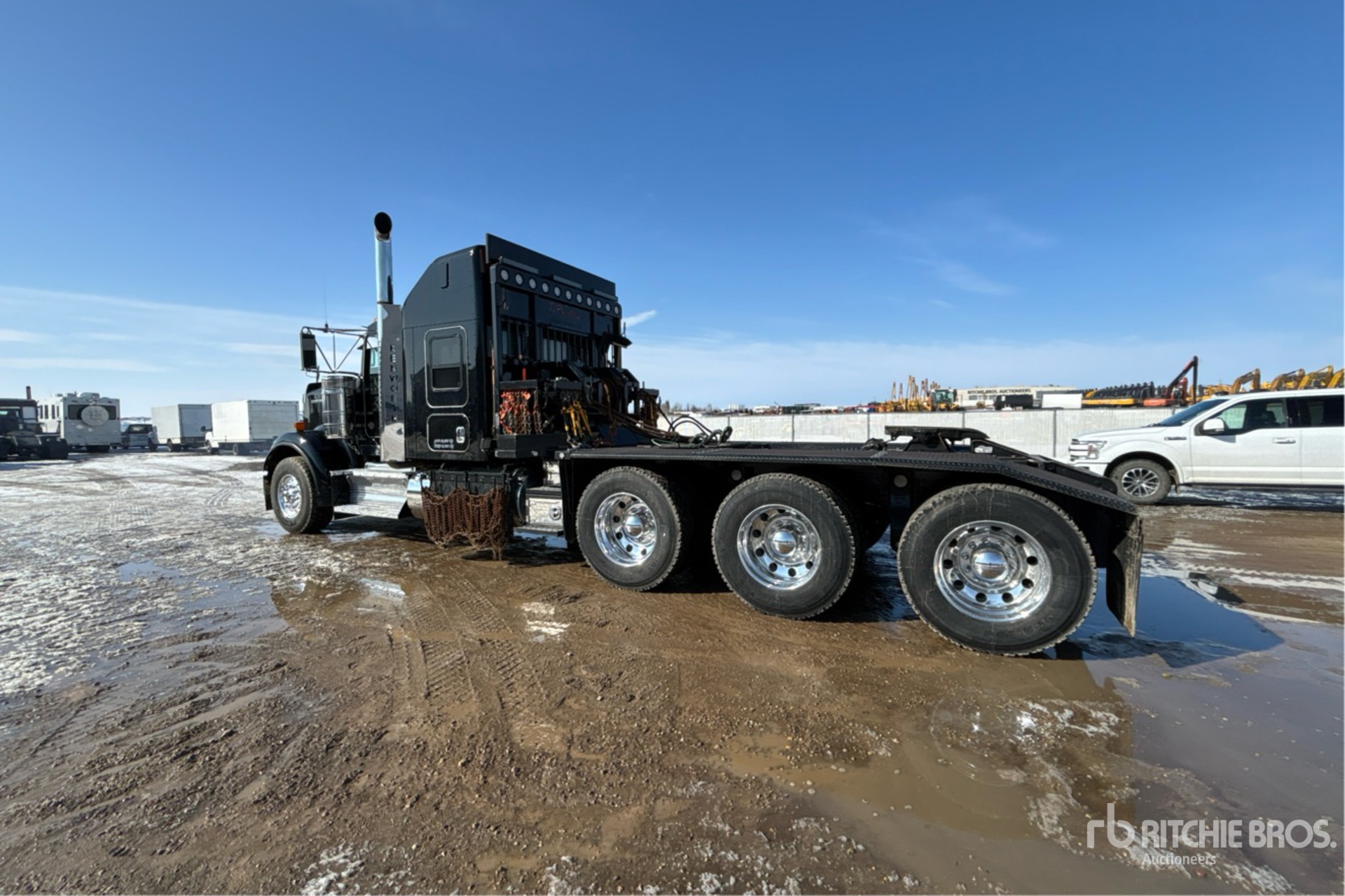 Cummins X15 6 Cylinder 15 L Diesel 565 hp Engine, 2024 US EPA Label, CARB Compliant, Requires Diesel Exhaust Fluid, 2414 Engine hrs, Engine Brake, Eaton Fuller 18-Speed Manual Transmission, Triple Differential Locks, 16000 lb Front Axle, 61000 lb Rears, 77000 lb GVWR, Air Ride Cab, 40 in Mid Roof Sleeper Cab, Aluminum Wheels, 385/65R22.5 Front Tires, 11R24.5 Rear Tires, Neway Air Ride Suspension, 270 in Wheelbase, PTO, Live Roll, Tulsa Hydraulic Winch, Complete-Dispersal-for-T-Ruckin-Oilfield-Services-Ltd