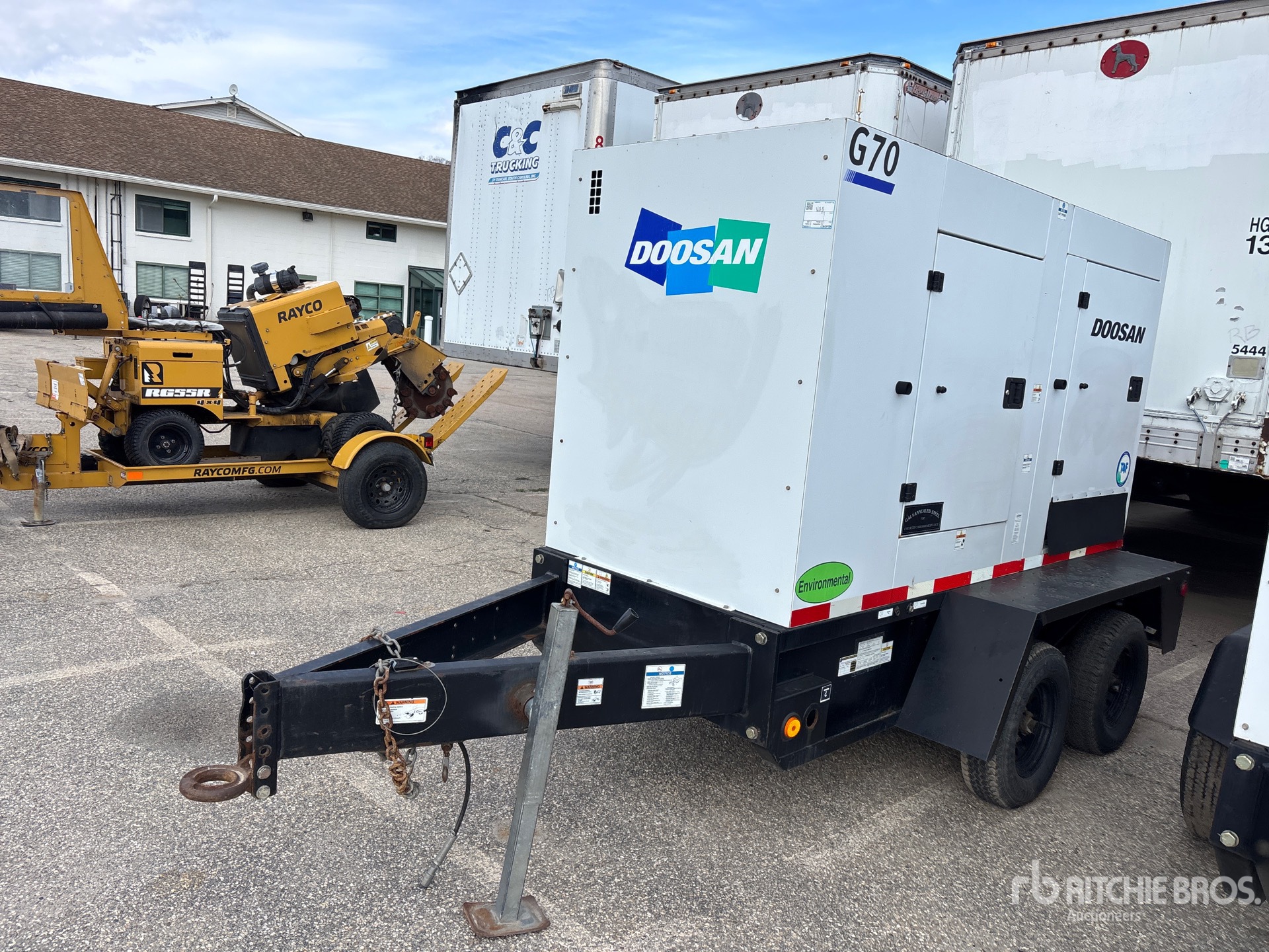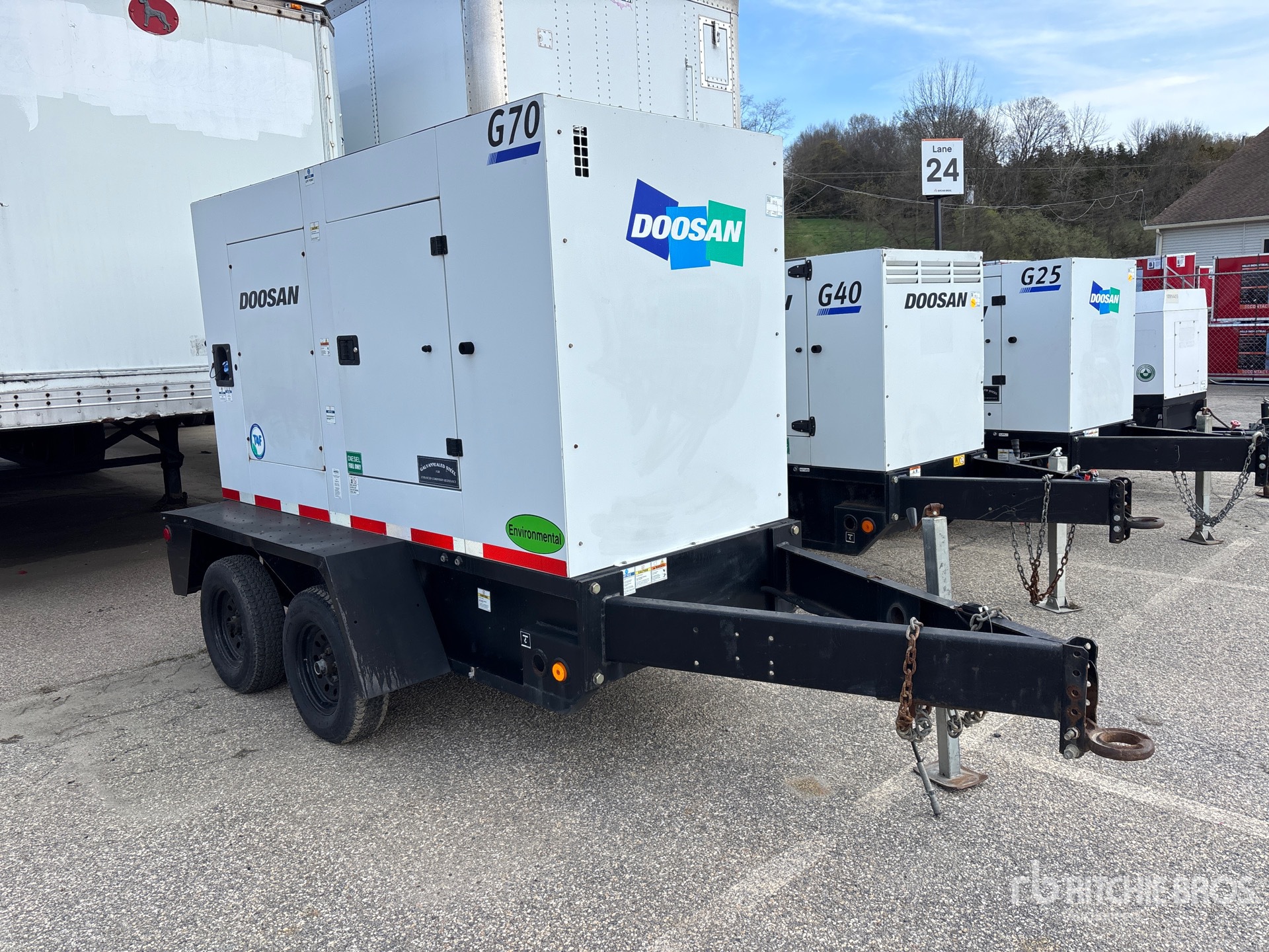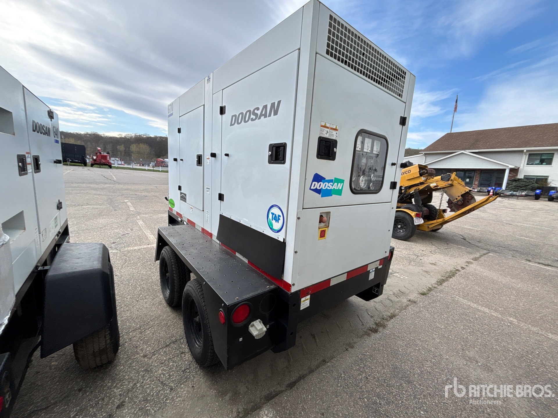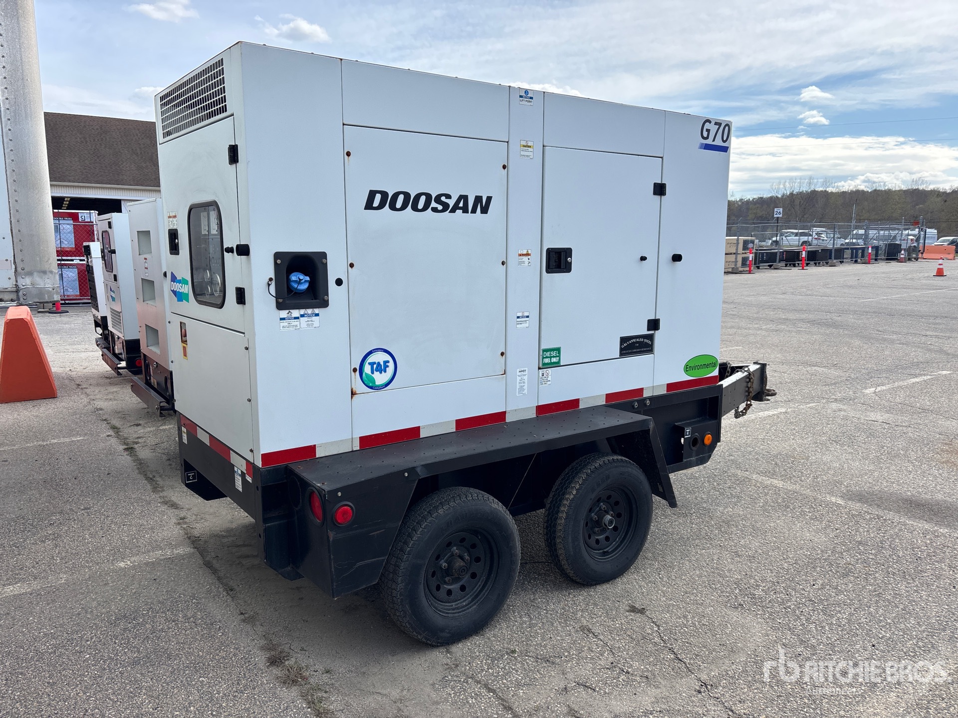 Tier 4, Doosan 4 Cylinder Diesel Engine, 70 kVA/56 kW Rated 3 Phase Output, 208 V / 240 V / 480 V Rated Voltage, 50 kVA,/50 kW, Rated Single Phase Output, 120 V / 240 V Rated Voltage, 240 V & 120 V Receptacles, Sound Attenuated, Bottom Mounted Fuel Tank, Lunette Ring Carrier Trailer, Electric Brakes