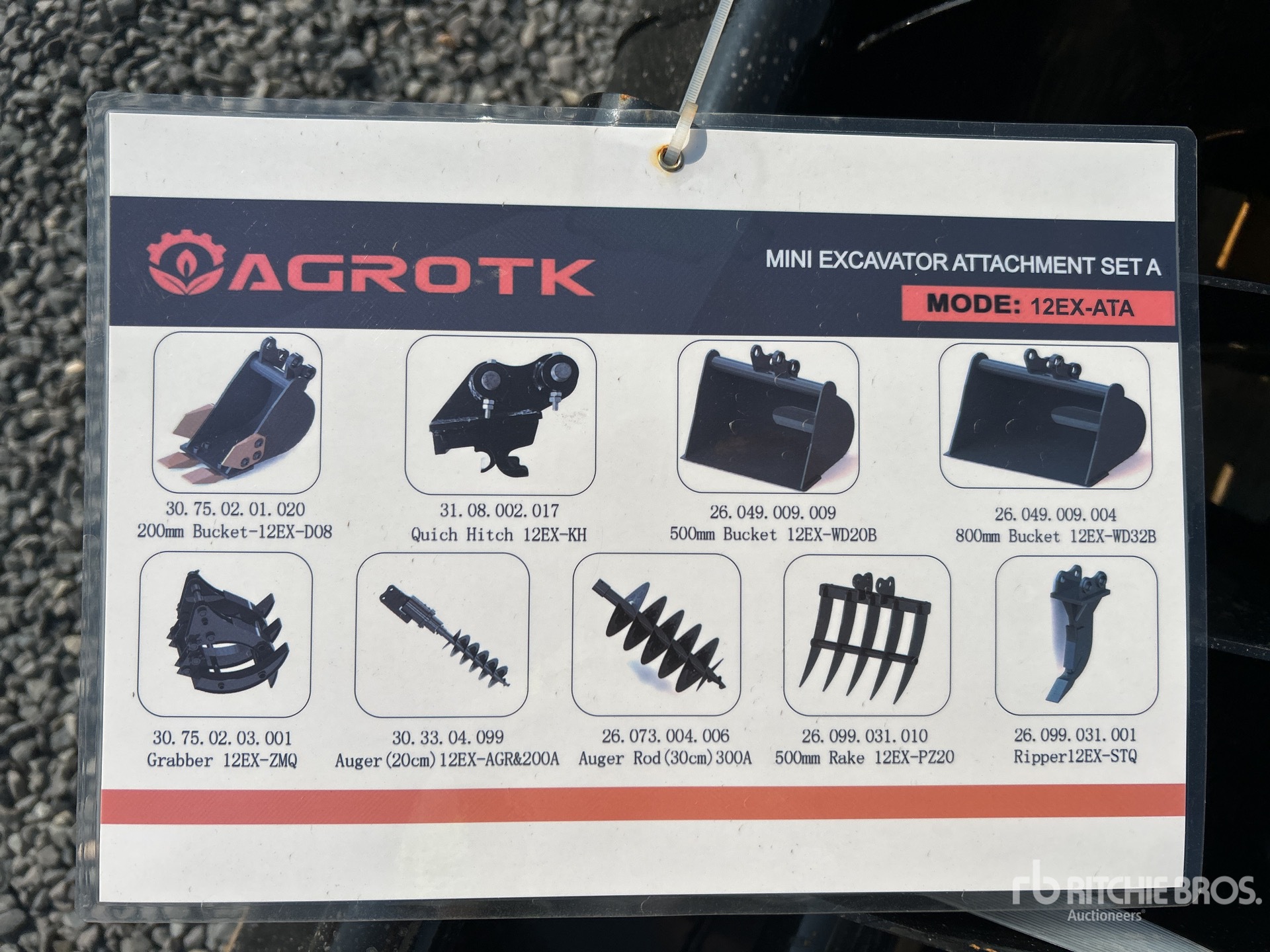 (1) 8 in Bucket, (1) 20 in Bucket, (1) 32 in Bucket, (1) Quick Coupler, (1) Ripper, (1) Grapple, (1) Rake, (1) 8 in Auger, (1) 12 in Auger,