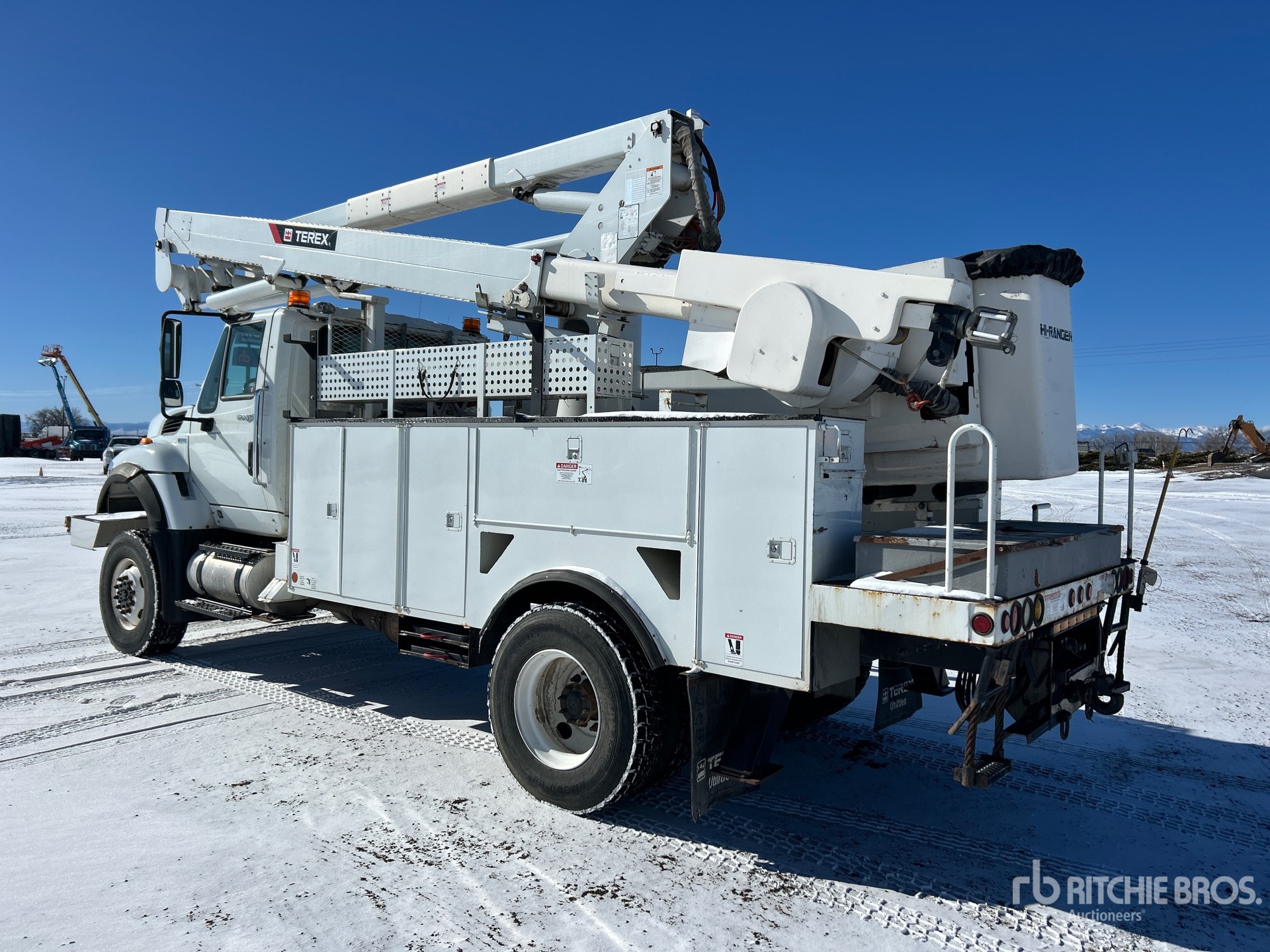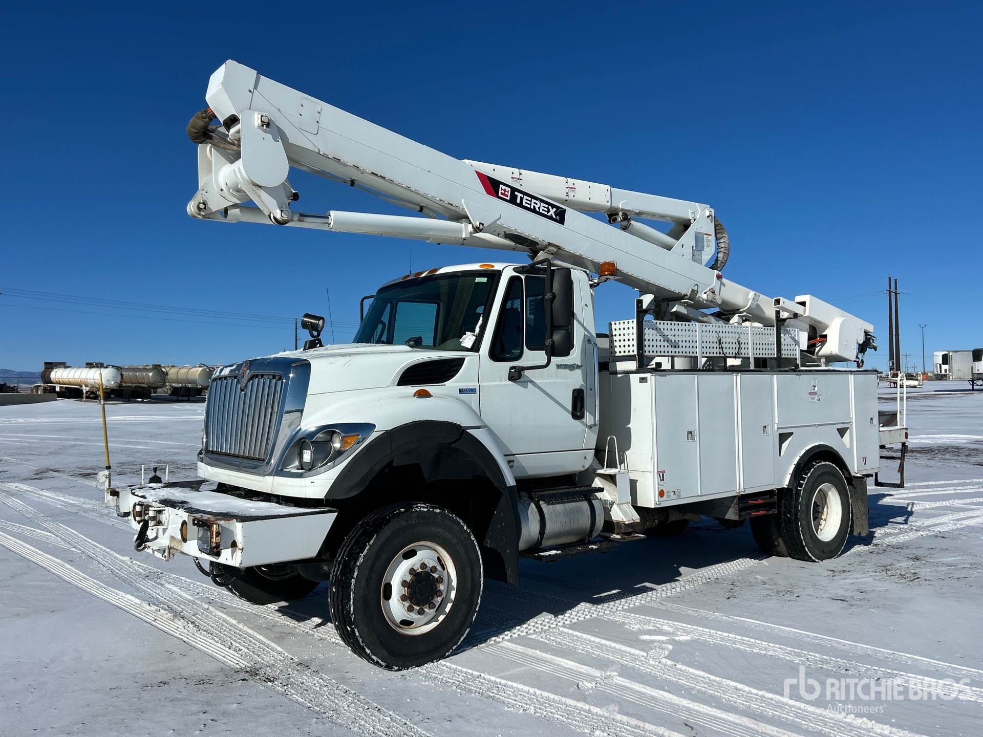 International MaxxForce 10 6 Cylinder 9.3 L Diesel 330 hp Engine, 2012 US EPA Label, 5327 Engine hrs, Allison Automatic Transmission, 16000 lb Front Axle, 21000 lb Rears, 37000 lb GVWR, 315/80R22.5, Spring Suspension, 196 in Wheelbase, PTO, 600 lb Capacity, Center Mounted, Insulated Two-Person Articulating-Telescopic Boom, Utility Body, Boom Tip Mounted Winch, Material Handling Jib, X-Type Outriggers, Rear Outriggers, Bumper Mounted Winch, 15 ft 6 in x 96 in Bed, Pintle Hitch